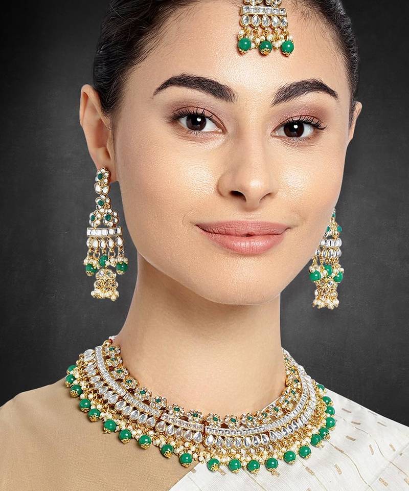 Aheli Green Choker Necklace With Earrings Maang Tikka For Women Indian Traditional Jewellery Set
