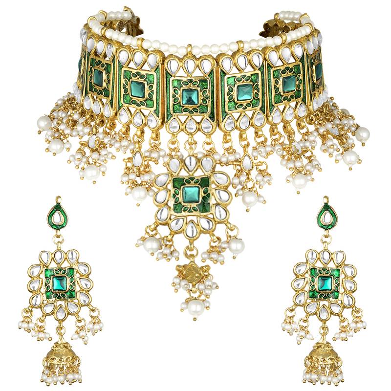 Aheli Green Meenakari Beads Studded Bridal Choker Necklace Earring Jewellery Set