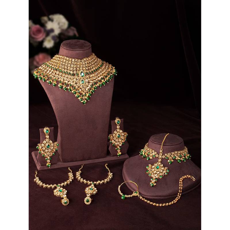 Dimensions: Necklace Length: 25.6 Cm X Width: 12 Cm; Earrings Length: 10.6 Cm X Width: 6.1 Cm; Nose Pin Ring 28 Cm X 6.2 Cm; Haath Panja Length: 15.2 Cm X Width: 10.5 Cm; Matha Patti Length: 26.2 Cm X Width: 11.2 Cm; Weight: 570 Grams
