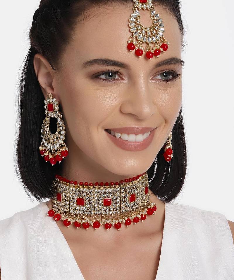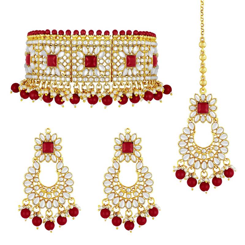 Aheli Kundan Choker Necklace With Earrings Maang Tikka For Women Indian Traditional Jewellery Set