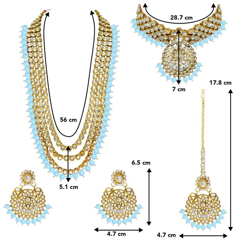 Dimensions: Long Necklace Length: 56 Cm X Width: 5.1 Cm; Short Necklace Length: 28.7 Cm X Width: 7 Cm; Earrings Length: 6.5 Cm X Width: 4.7 Cm; Maangtikka Length: 17.8 Cm X Width: 4.7 Cm; Weight: 401 Grams