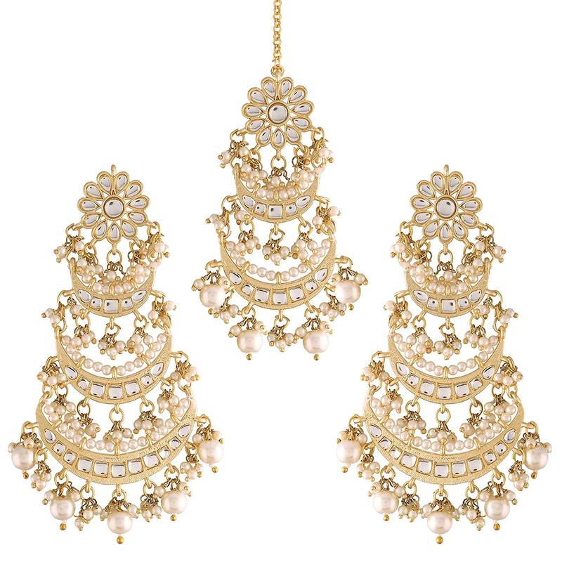 Aheli Kundan Pearl Long Dangle Chandbali Earring Maang Tikka Jewellery Set For Women
