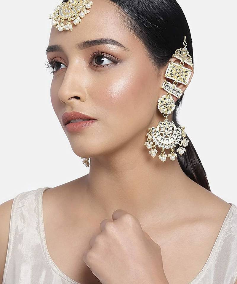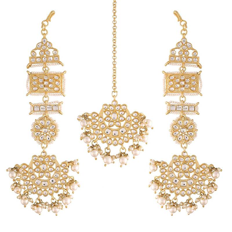 Aheli Long Traditional Kundan Faux Pearl Chandbali Earrings With Maang Tikka Set For Women