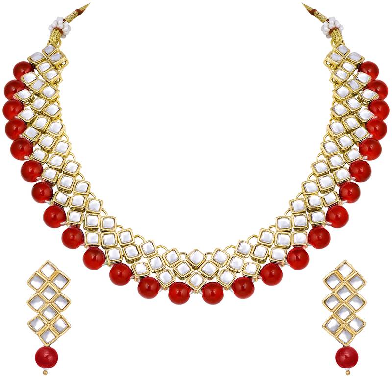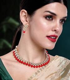 Aheli Red Indian Ethnic Kundan Pearl Fancy Bridal Traditional Choker Necklace Jewellery Set With Earrings