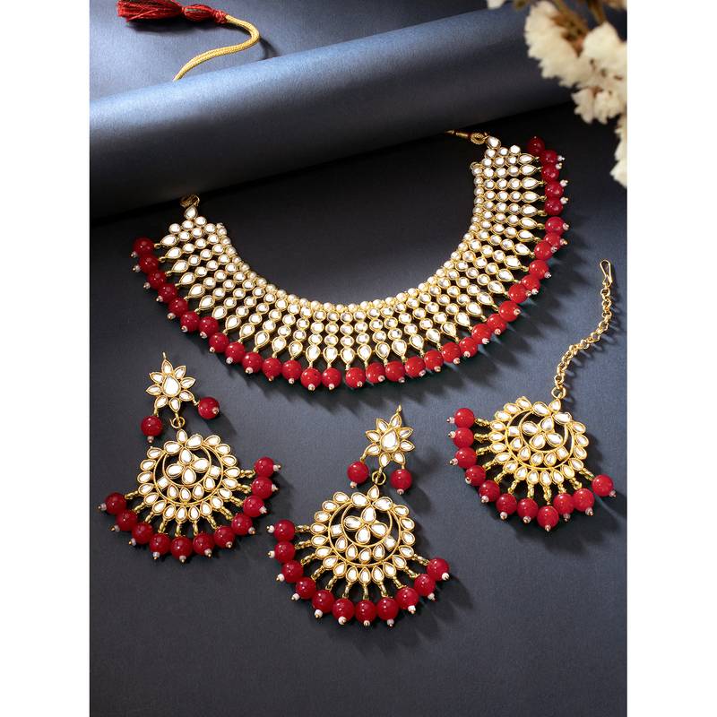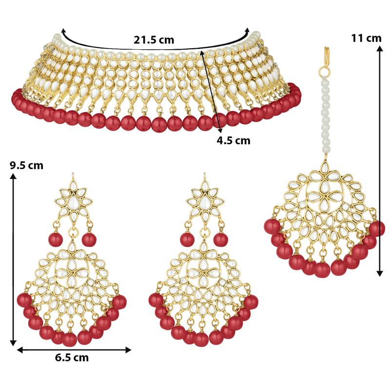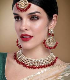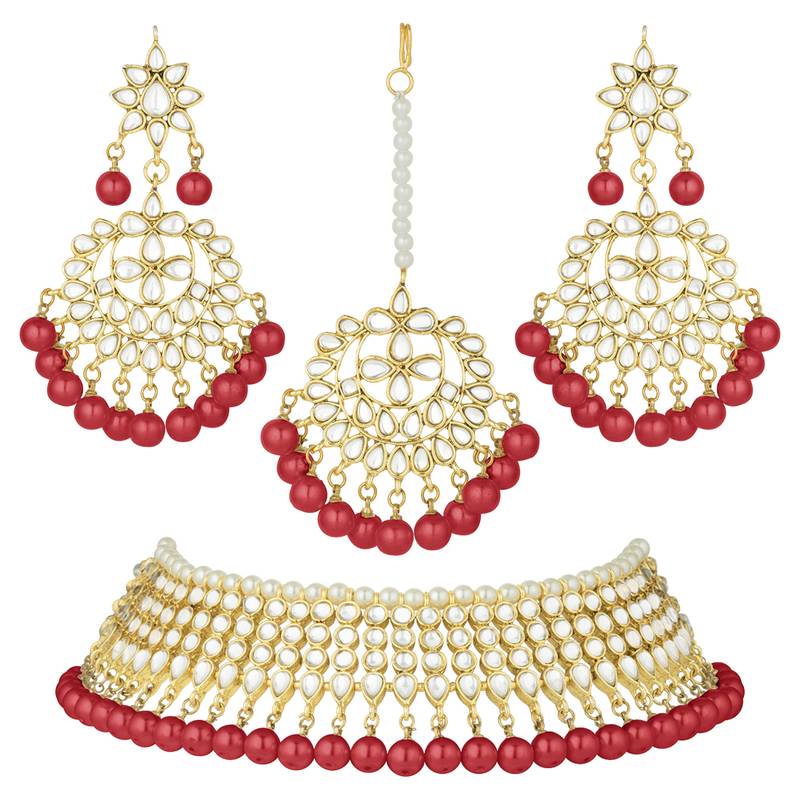 Aheli Red Indian Ethnic Kundan Pearl Fancy Bridal Traditional Necklace Jewellery Set With Earrings