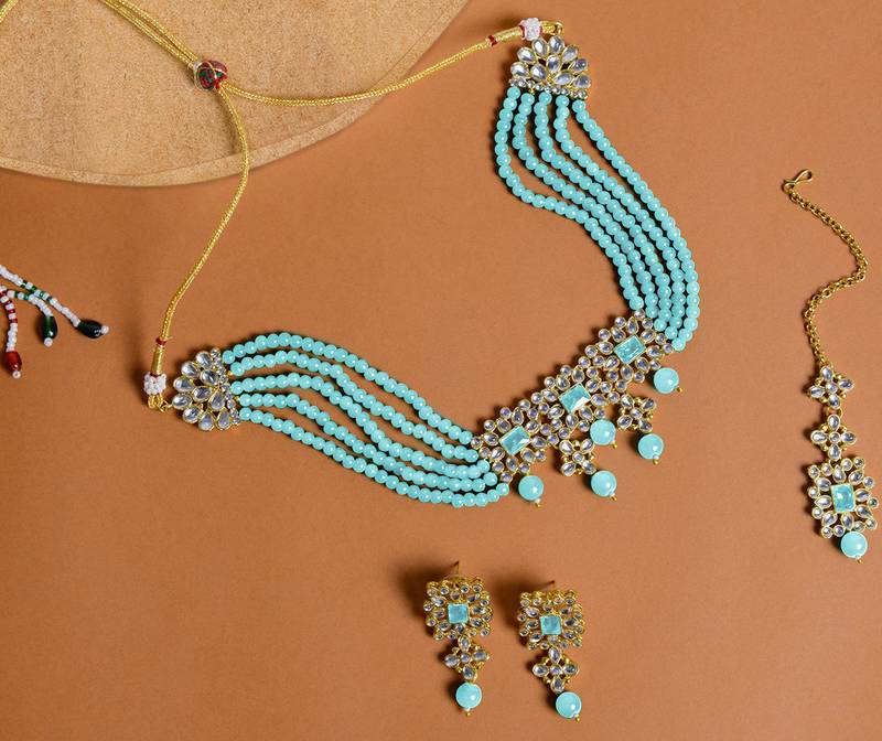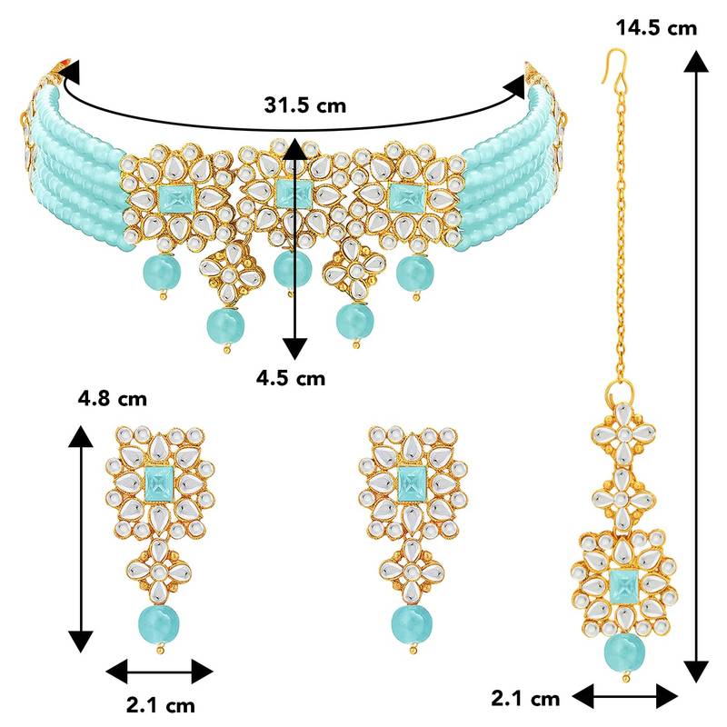 | Product Name | Aheli Sky Blue Choker Necklace With Earring Maang Tikka Jewellery Set For Women | |