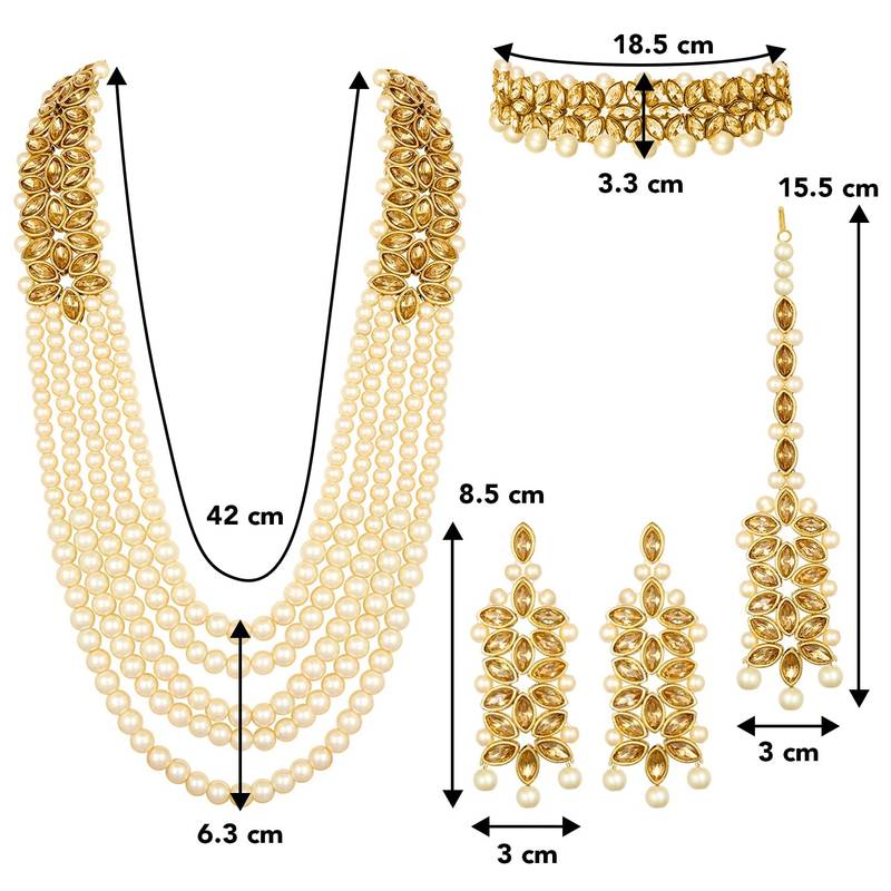 Dimensions: Long Necklace Length: 42 Cm X Width: 6.3 Cm; Choker Necklace Length: 18.5 Cm X Width: 3.3 Cm; Earrings Length: 8.5 Cm X Width: 2.9 Cm; Maang Tikka Length:15.5 Cm X Width 3 Cm, Weight:246.64 Grams