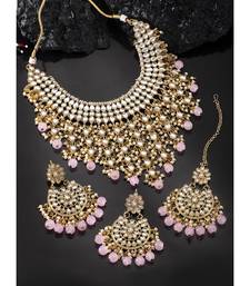 Aheli traditional kundan & pearl drop pink choker necklace earring set with maang tikka for women