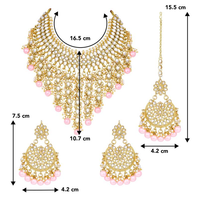 Aheli Traditional Kundan & Pearl Drop Pink Choker Necklace Earring Set With Maang Tikka For Women