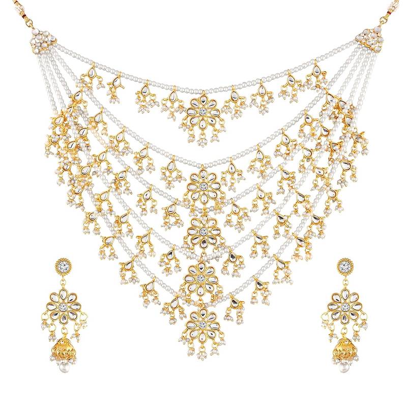 Aheli Traditional Kundan Pearl Floral Layered Long Necklace With Earring Jewellery Set For Women