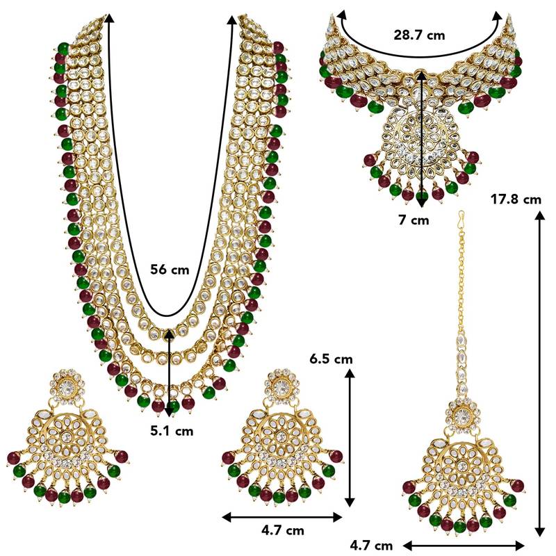 Dimensions: Long Necklace Length: 56 Cm X Width: 5.1 Cm; Short Necklace Length: 28.7 Cm X Width: 7 Cm; Earrings Length: 6.5 Cm X Width: 4.7 Cm; Maangtikka Length: 17.8 Cm X Width: 4.7 Cm; Weight: 401 Grams