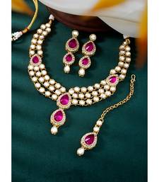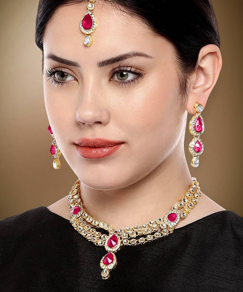 Aheli Traditional Rani Pink Kundan Necklace Earring Maang Tikka Jewellery Set