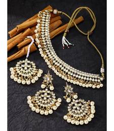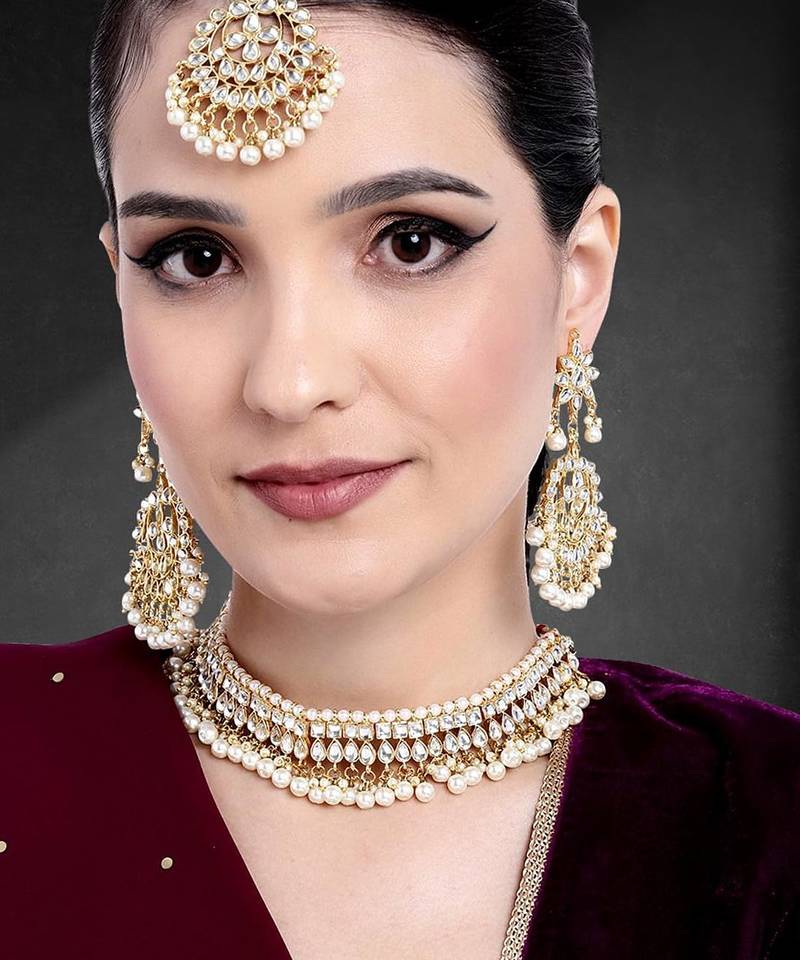 Aheli white kundan pearl choker necklace earring maang tikka traditional jewellery set for women