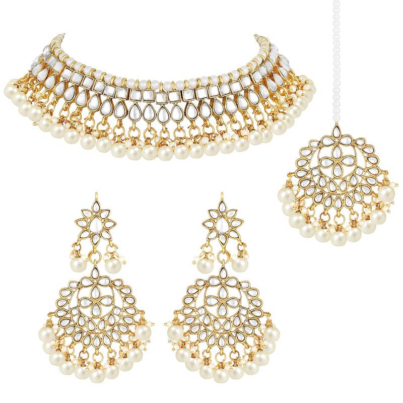 Aheli White Kundan Pearl Choker Necklace Earring Maang Tikka Traditional Jewellery Set For Women