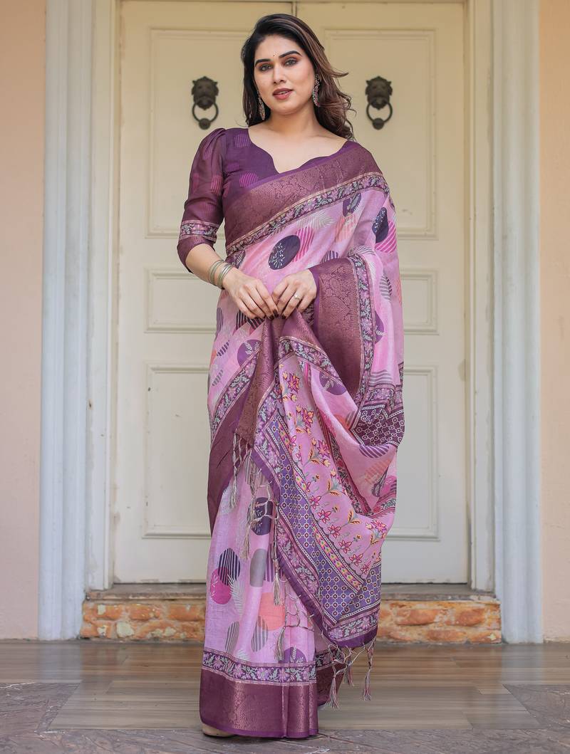 | Product Description | Embrace Effortless Elegance With This Handloom Linen Weaved With Golden Zari Floral Printed Saree, Crafted To Bring Together Heritage Artistry And Modern Comfort. Made From Premium Handloom Linen Weaved With Golden Zari, This Saree Showcases Delicate Floral Digital Prints That Bloom Across The Fabric With A Soft, Artistic Touch. Edged With Playful Tassels On The Pallu, It Adds A Charming Flair That Complements Both Casual And Festive Occasions. The Breathable And Lightweight Texture Of Pure Handloom Linen Weaved With Golden Zari Ensures All Day Comfort, Especially In Warmer Climates. Whether You're Attending A Daytime Celebration, Festive Gathering, Cultural Event, Or Even A Sophisticated Work Meeting, This Saree Offers The Perfect Blend Of Grace, Comfort, And Style. This Saree Comes With A Coordinated 0.8 Meter Attached Blouse Piece, Designed To Complement The Floral Motif And Complete Your Ethnic Look. Why Choose Handloom Linen Weaved With Golden Zari Sarees? 🌿 Eco Friendly & Skin Friendly: Linen Weaved With Golden Zari Is A Natural Fiber That's Gentle On The Skin And Kind To The Planet. 🌸 Timeless Aesthetic: Handloom Weave Adds A Rich, Artisanal Touch To The Fabric, Making Each Piece Unique. ☀️ Ideal For All Seasons: The Fabric Is Breathable In Summer And Warm In Winter, Making It A Versatile Wardrobe Staple. 🎨 Digitally Printed Florals: Artistic Prints Bring A Refreshing, Youthful Vibe To Traditional Wear. Where To Wear: ✅ Festive Functions & Poojas ✅ Ethnic Day At Office Or Colleges ✅ Family Gatherings & Cultural Programs ✅ Summer Weddings, Sangeet & Haldi Events ✅ Casual Brunches And Saree Meet Ups Product Highlights: Fabric: Pure Handloom Linen Weaved With Golden Zari Design: Digital Floral Print With Tassels On Pallu Saree Length: 5.5 Meters Blouse Piece: 0.8 Meter Unstitched (Attached) Comfort Level: Lightweight, Breathable, And Soft On Skin Care: Dry Clean Or Gentle Hand Wash For Longer Durability Style Tip: