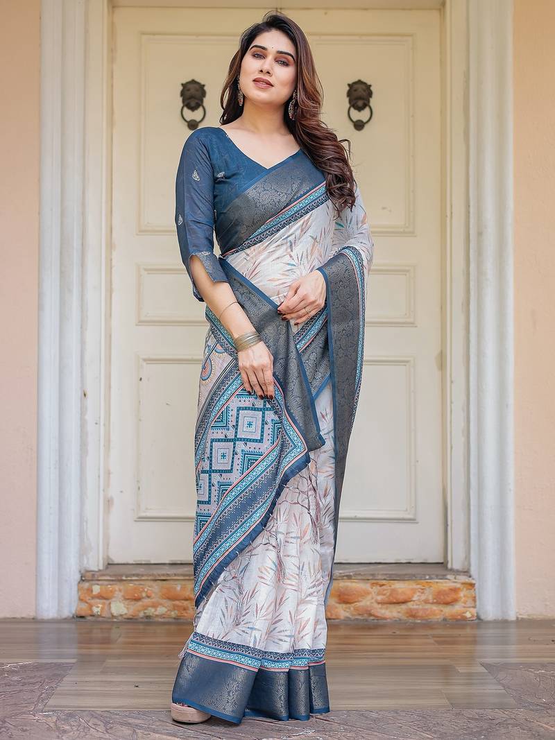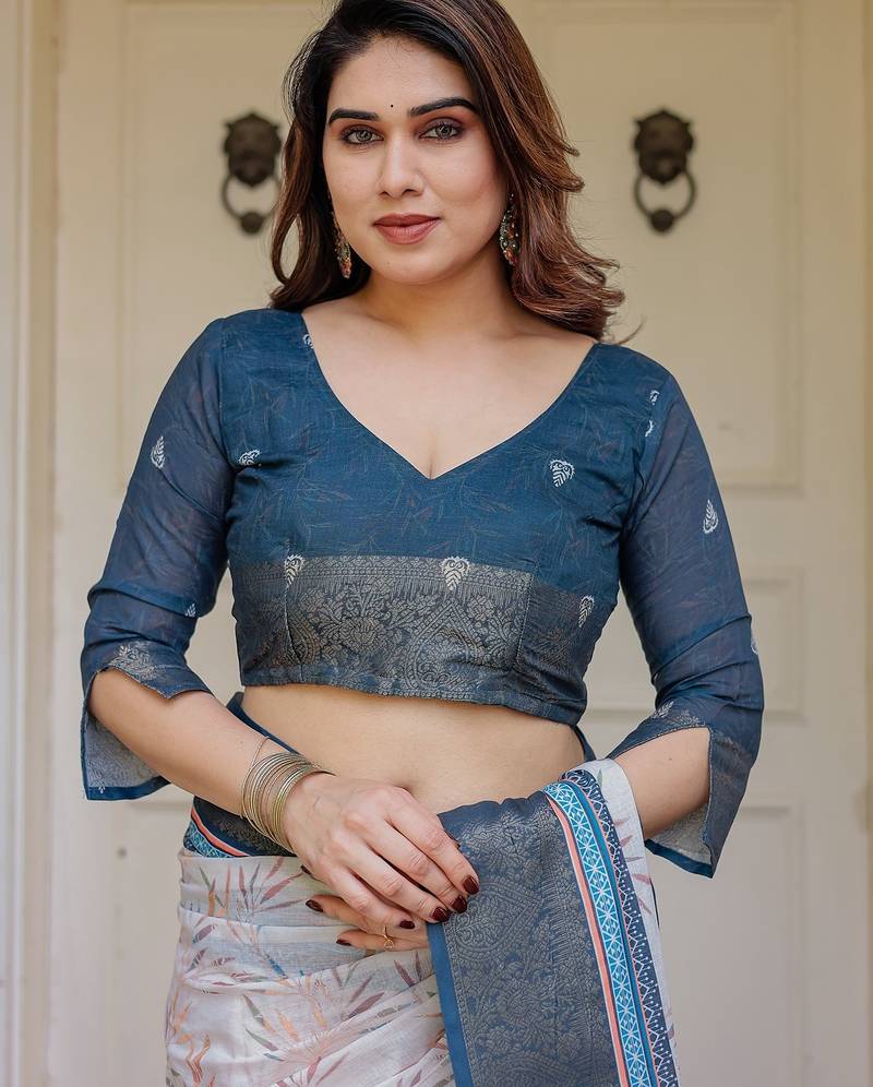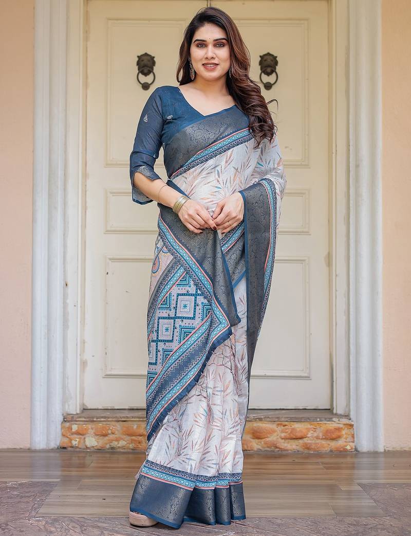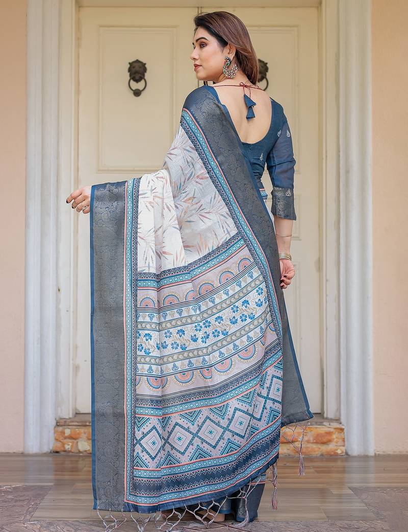 | Product Description | Embrace Effortless Elegance With This Handloom Linen Weaved With Golden Zari Floral Printed Saree, Crafted To Bring Together Heritage Artistry And Modern Comfort. Made From Premium Handloom Linen Weaved With Golden Zari, This Saree Showcases Delicate Floral Digital Prints That Bloom Across The Fabric With A Soft, Artistic Touch. Edged With Playful Tassels On The Pallu, It Adds A Charming Flair That Complements Both Casual And Festive Occasions. The Breathable And Lightweight Texture Of Pure Handloom Linen Weaved With Golden Zari Ensures All Day Comfort, Especially In Warmer Climates. Whether You're Attending A Daytime Celebration, Festive Gathering, Cultural Event, Or Even A Sophisticated Work Meeting, This Saree Offers The Perfect Blend Of Grace, Comfort, And Style. This Saree Comes With A Coordinated 0.8 Meter Attached Blouse Piece, Designed To Complement The Floral Motif And Complete Your Ethnic Look. Why Choose Handloom Linen Weaved With Golden Zari Sarees? 🌿 Eco Friendly & Skin Friendly: Linen Weaved With Golden Zari Is A Natural Fiber That's Gentle On The Skin And Kind To The Planet. 🌸 Timeless Aesthetic: Handloom Weave Adds A Rich, Artisanal Touch To The Fabric, Making Each Piece Unique. ☀️ Ideal For All Seasons: The Fabric Is Breathable In Summer And Warm In Winter, Making It A Versatile Wardrobe Staple. 🎨 Digitally Printed Florals: Artistic Prints Bring A Refreshing, Youthful Vibe To Traditional Wear. Where To Wear: ✅ Festive Functions & Poojas ✅ Ethnic Day At Office Or Colleges ✅ Family Gatherings & Cultural Programs ✅ Summer Weddings, Sangeet & Haldi Events ✅ Casual Brunches And Saree Meet Ups Product Highlights: Fabric: Pure Handloom Linen Weaved With Golden Zari Design: Digital Floral Print With Tassels On Pallu Saree Length: 5.5 Meters Blouse Piece: 0.8 Meter Unstitched (Attached) Comfort Level: Lightweight, Breathable, And Soft On Skin Care: Dry Clean Or Gentle Hand Wash For Longer Durability Style Tip: