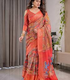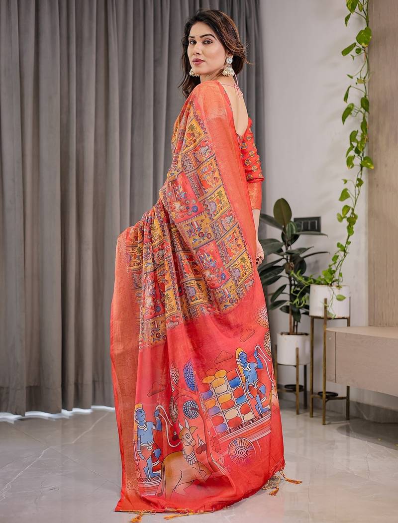 | Product Description | Embrace Effortless Elegance With This Handloom Linen Weaved With Golden Zari Floral Printed Saree, Crafted To Bring Together Heritage Artistry And Modern Comfort. Made From Premium Handloom Linen Weaved With Golden Zari, This Saree Showcases Delicate Floral Digital Prints That Bloom Across The Fabric With A Soft, Artistic Touch. Edged With Playful Tassels On The Pallu, It Adds A Charming Flair That Complements Both Casual And Festive Occasions. The Breathable And Lightweight Texture Of Pure Handloom Linen Weaved With Golden Zari Ensures All Day Comfort, Especially In Warmer Climates. Whether You're Attending A Daytime Celebration, Festive Gathering, Cultural Event, Or Even A Sophisticated Work Meeting, This Saree Offers The Perfect Blend Of Grace, Comfort, And Style. This Saree Comes With A Coordinated 0.8 Meter Attached Blouse Piece, Designed To Complement The Floral Motif And Complete Your Ethnic Look. Why Choose Handloom Linen Weaved With Golden Zari Sarees? 🌿 Eco Friendly & Skin Friendly: Linen Weaved With Golden Zari Is A Natural Fiber That's Gentle On The Skin And Kind To The Planet. 🌸 Timeless Aesthetic: Handloom Weave Adds A Rich, Artisanal Touch To The Fabric, Making Each Piece Unique. ☀️ Ideal For All Seasons: The Fabric Is Breathable In Summer And Warm In Winter, Making It A Versatile Wardrobe Staple. 🎨 Digitally Printed Florals: Artistic Prints Bring A Refreshing, Youthful Vibe To Traditional Wear. Where To Wear: ✅ Festive Functions & Poojas ✅ Ethnic Day At Office Or Colleges ✅ Family Gatherings & Cultural Programs ✅ Summer Weddings, Sangeet & Haldi Events ✅ Casual Brunches And Saree Meet Ups Product Highlights: Fabric: Pure Handloom Linen Weaved With Golden Zari Design: Digital Floral Print With Tassels On Pallu Saree Length: 5.5 Meters Blouse Piece: 0.8 Meter Unstitched (Attached) Comfort Level: Lightweight, Breathable, And Soft On Skin Care: Dry Clean Or Gentle Hand Wash For Longer Durability Style Tip: