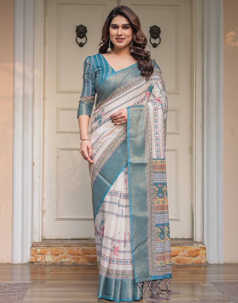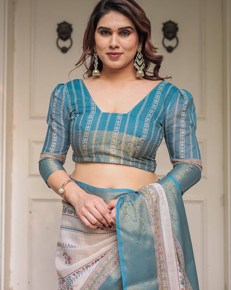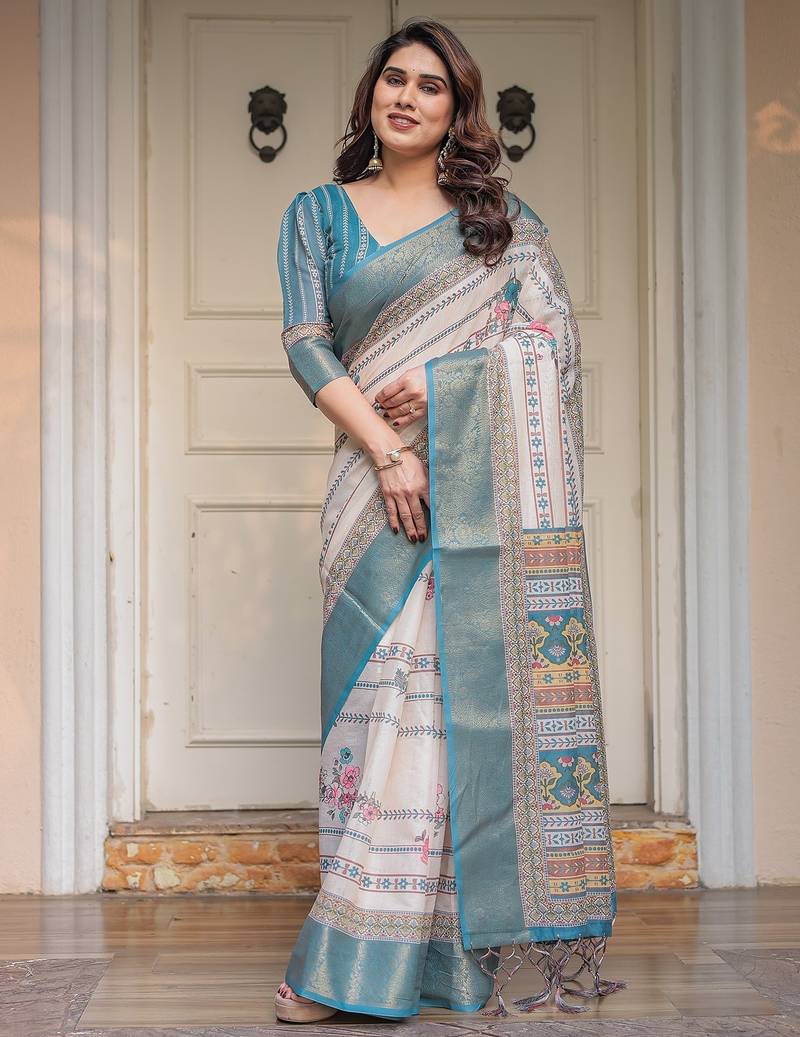 | Product Description | Embrace Effortless Elegance With This Handloom Linen Weaved With Golden Zari Floral Printed Saree, Crafted To Bring Together Heritage Artistry And Modern Comfort. Made From Premium Handloom Linen Weaved With Golden Zari, This Saree Showcases Delicate Floral Digital Prints That Bloom Across The Fabric With A Soft, Artistic Touch. Edged With Playful Tassels On The Pallu, It Adds A Charming Flair That Complements Both Casual And Festive Occasions. The Breathable And Lightweight Texture Of Pure Handloom Linen Weaved With Golden Zari Ensures All Day Comfort, Especially In Warmer Climates. Whether You're Attending A Daytime Celebration, Festive Gathering, Cultural Event, Or Even A Sophisticated Work Meeting, This Saree Offers The Perfect Blend Of Grace, Comfort, And Style. This Saree Comes With A Coordinated 0.8 Meter Attached Blouse Piece, Designed To Complement The Floral Motif And Complete Your Ethnic Look. Why Choose Handloom Linen Weaved With Golden Zari Sarees? 🌿 Eco Friendly & Skin Friendly: Linen Weaved With Golden Zari Is A Natural Fiber That's Gentle On The Skin And Kind To The Planet. 🌸 Timeless Aesthetic: Handloom Weave Adds A Rich, Artisanal Touch To The Fabric, Making Each Piece Unique. ☀️ Ideal For All Seasons: The Fabric Is Breathable In Summer And Warm In Winter, Making It A Versatile Wardrobe Staple. 🎨 Digitally Printed Florals: Artistic Prints Bring A Refreshing, Youthful Vibe To Traditional Wear. Where To Wear: ✅ Festive Functions & Poojas ✅ Ethnic Day At Office Or Colleges ✅ Family Gatherings & Cultural Programs ✅ Summer Weddings, Sangeet & Haldi Events ✅ Casual Brunches And Saree Meet Ups Product Highlights: Fabric: Pure Handloom Linen Weaved With Golden Zari Design: Digital Floral Print With Tassels On Pallu Saree Length: 5.5 Meters Blouse Piece: 0.8 Meter Unstitched (Attached) Comfort Level: Lightweight, Breathable, And Soft On Skin Care: Dry Clean Or Gentle Hand Wash For Longer Durability Style Tip: