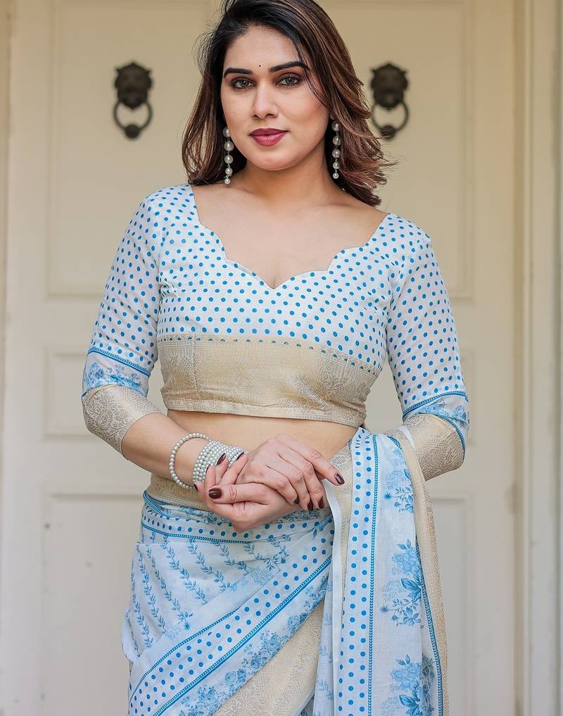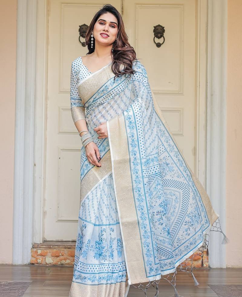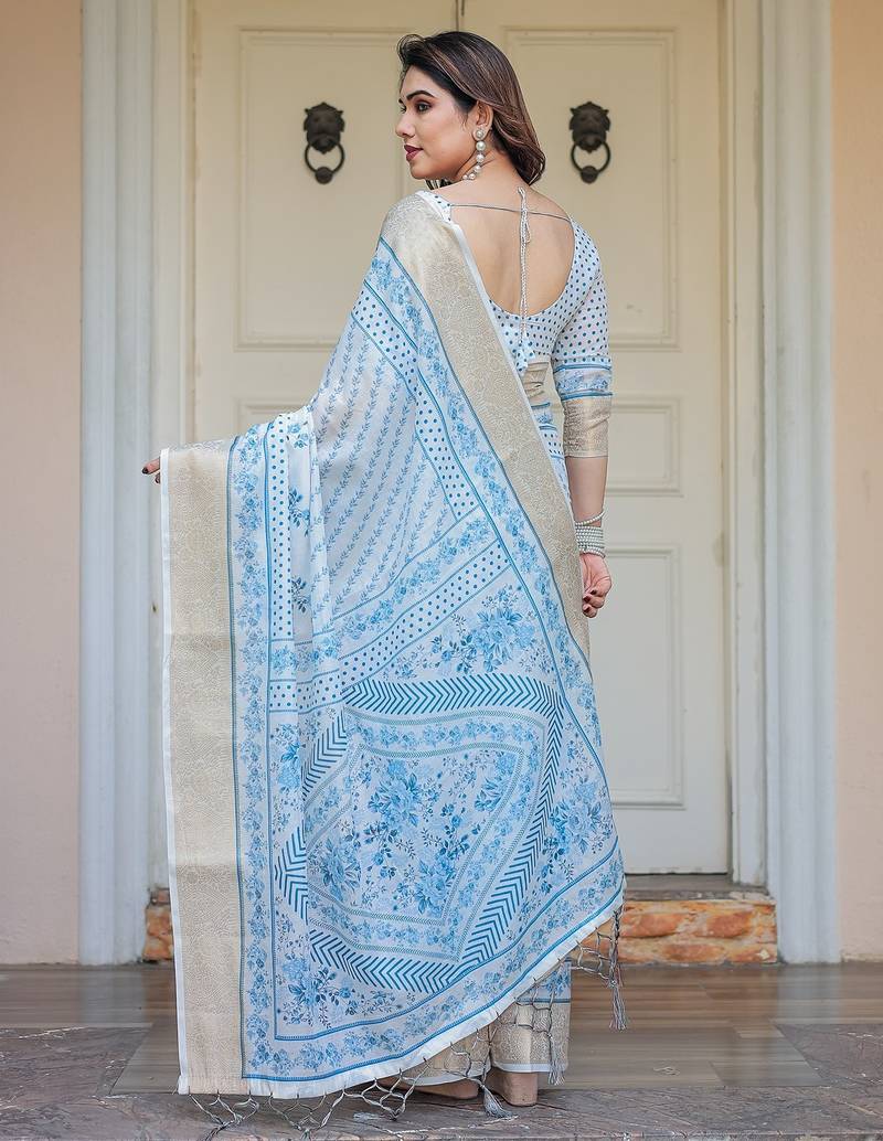 | Product Description | Embrace Effortless Elegance With This Handloom Linen Weaved With Golden Zari Floral Printed Saree, Crafted To Bring Together Heritage Artistry And Modern Comfort. Made From Premium Handloom Linen Weaved With Golden Zari, This Saree Showcases Delicate Floral Digital Prints That Bloom Across The Fabric With A Soft, Artistic Touch. Edged With Playful Tassels On The Pallu, It Adds A Charming Flair That Complements Both Casual And Festive Occasions. The Breathable And Lightweight Texture Of Pure Handloom Linen Weaved With Golden Zari Ensures All Day Comfort, Especially In Warmer Climates. Whether You're Attending A Daytime Celebration, Festive Gathering, Cultural Event, Or Even A Sophisticated Work Meeting, This Saree Offers The Perfect Blend Of Grace, Comfort, And Style. This Saree Comes With A Coordinated 0.8 Meter Attached Blouse Piece, Designed To Complement The Floral Motif And Complete Your Ethnic Look. Why Choose Handloom Linen Weaved With Golden Zari Sarees? 🌿 Eco Friendly & Skin Friendly: Linen Weaved With Golden Zari Is A Natural Fiber That's Gentle On The Skin And Kind To The Planet. 🌸 Timeless Aesthetic: Handloom Weave Adds A Rich, Artisanal Touch To The Fabric, Making Each Piece Unique. ☀️ Ideal For All Seasons: The Fabric Is Breathable In Summer And Warm In Winter, Making It A Versatile Wardrobe Staple. 🎨 Digitally Printed Florals: Artistic Prints Bring A Refreshing, Youthful Vibe To Traditional Wear. Where To Wear: ✅ Festive Functions & Poojas ✅ Ethnic Day At Office Or Colleges ✅ Family Gatherings & Cultural Programs ✅ Summer Weddings, Sangeet & Haldi Events ✅ Casual Brunches And Saree Meet Ups Product Highlights: Fabric: Pure Handloom Linen Weaved With Golden Zari Design: Digital Floral Print With Tassels On Pallu Saree Length: 5.5 Meters Blouse Piece: 0.8 Meter Unstitched (Attached) Comfort Level: Lightweight, Breathable, And Soft On Skin Care: Dry Clean Or Gentle Hand Wash For Longer Durability Style Tip: