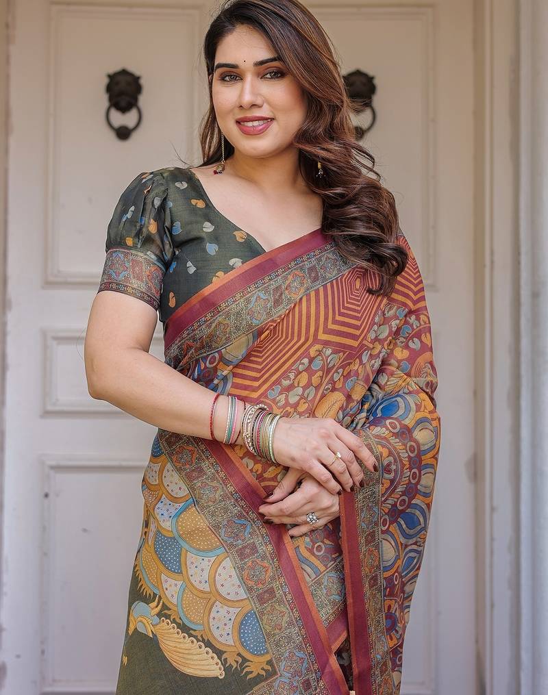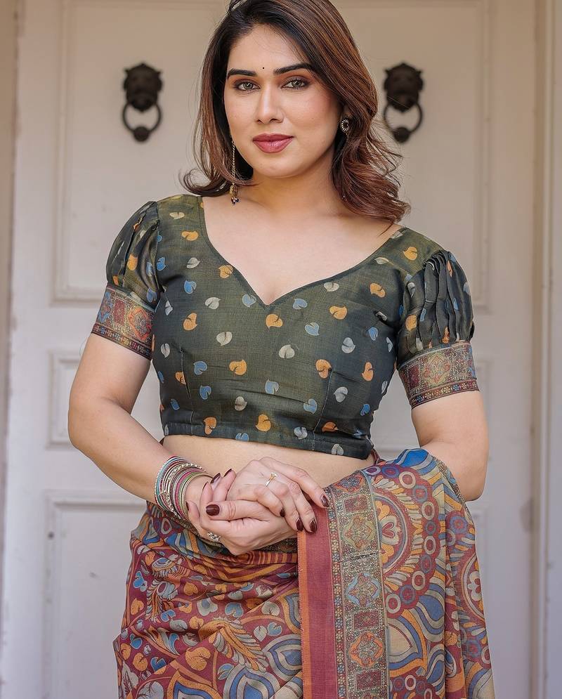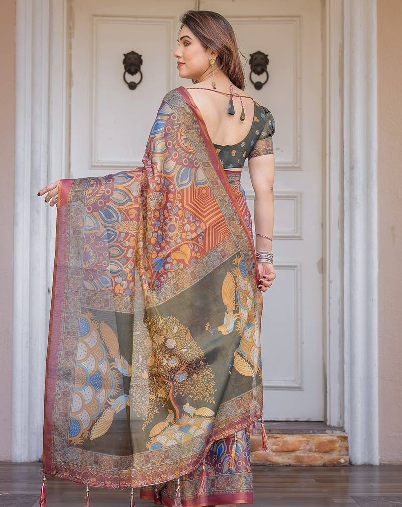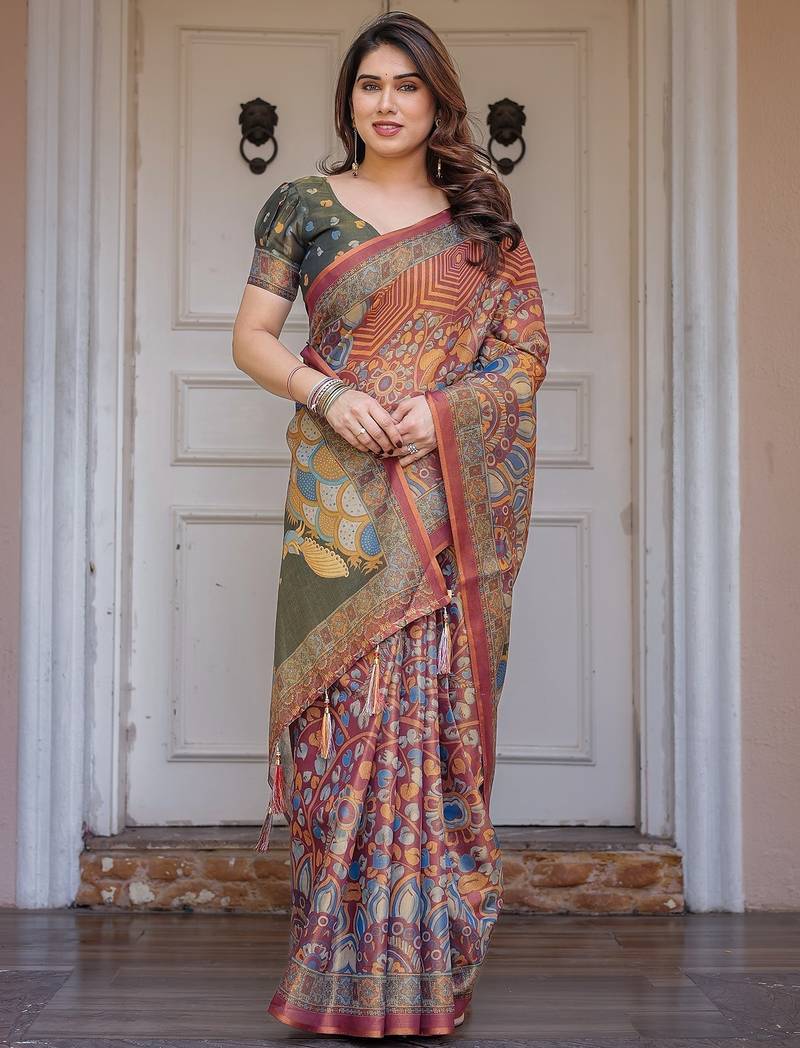| Product Description | Embrace Effortless Elegance With This Handloom Linen Weaved With Golden Zari Floral Printed Saree, Crafted To Bring Together Heritage Artistry And Modern Comfort. Made From Premium Handloom Linen Weaved With Golden Zari, This Saree Showcases Delicate Floral Digital Prints That Bloom Across The Fabric With A Soft, Artistic Touch. Edged With Playful Tassels On The Pallu, It Adds A Charming Flair That Complements Both Casual And Festive Occasions. The Breathable And Lightweight Texture Of Pure Handloom Linen Weaved With Golden Zari Ensures All Day Comfort, Especially In Warmer Climates. Whether You're Attending A Daytime Celebration, Festive Gathering, Cultural Event, Or Even A Sophisticated Work Meeting, This Saree Offers The Perfect Blend Of Grace, Comfort, And Style. This Saree Comes With A Coordinated 0.8 Meter Attached Blouse Piece, Designed To Complement The Floral Motif And Complete Your Ethnic Look. Why Choose Handloom Linen Weaved With Golden Zari Sarees? 🌿 Eco Friendly & Skin Friendly: Linen Weaved With Golden Zari Is A Natural Fiber That's Gentle On The Skin And Kind To The Planet. 🌸 Timeless Aesthetic: Handloom Weave Adds A Rich, Artisanal Touch To The Fabric, Making Each Piece Unique. ☀️ Ideal For All Seasons: The Fabric Is Breathable In Summer And Warm In Winter, Making It A Versatile Wardrobe Staple. 🎨 Digitally Printed Florals: Artistic Prints Bring A Refreshing, Youthful Vibe To Traditional Wear. Where To Wear: ✅ Festive Functions & Poojas ✅ Ethnic Day At Office Or Colleges ✅ Family Gatherings & Cultural Programs ✅ Summer Weddings, Sangeet & Haldi Events ✅ Casual Brunches And Saree Meet Ups Product Highlights: Fabric: Pure Handloom Linen Weaved With Golden Zari Design: Digital Floral Print With Tassels On Pallu Saree Length: 5.5 Meters Blouse Piece: 0.8 Meter Unstitched (Attached) Comfort Level: Lightweight, Breathable, And Soft On Skin Care: Dry Clean Or Gentle Hand Wash For Longer Durability Style Tip: