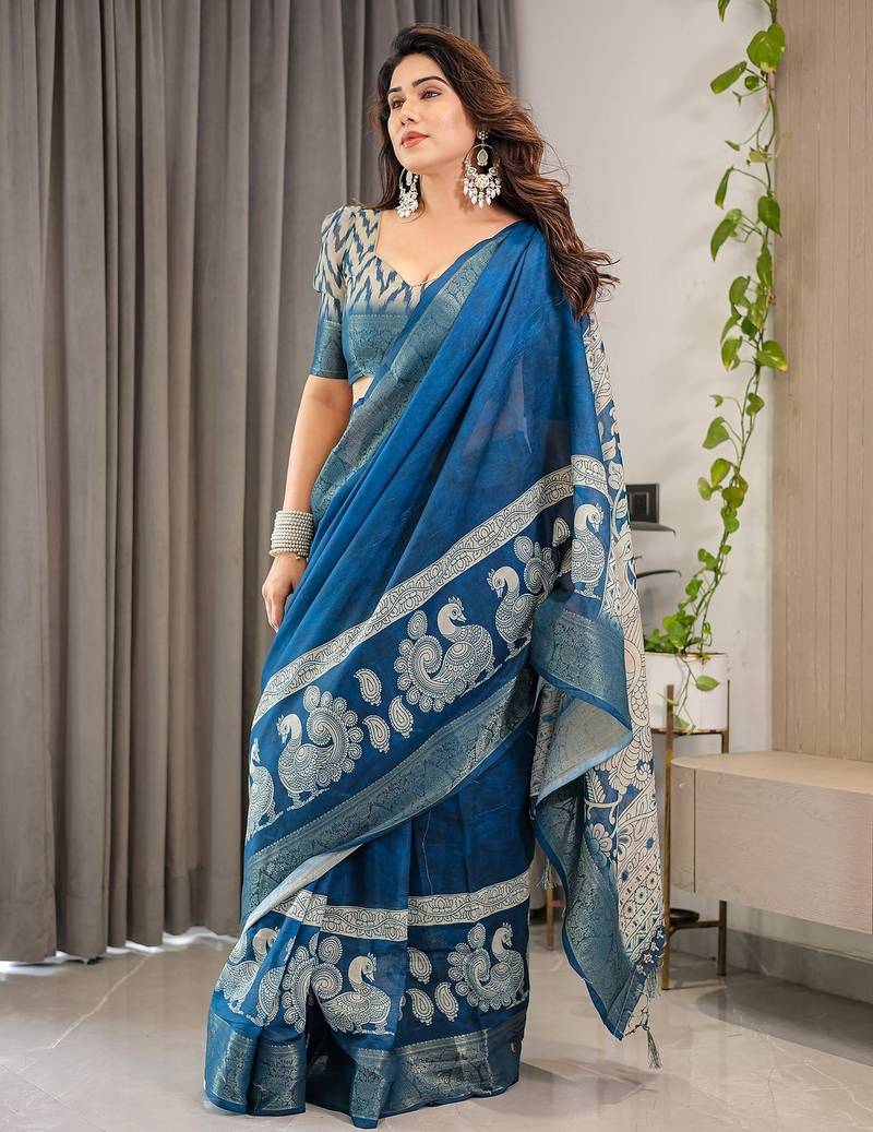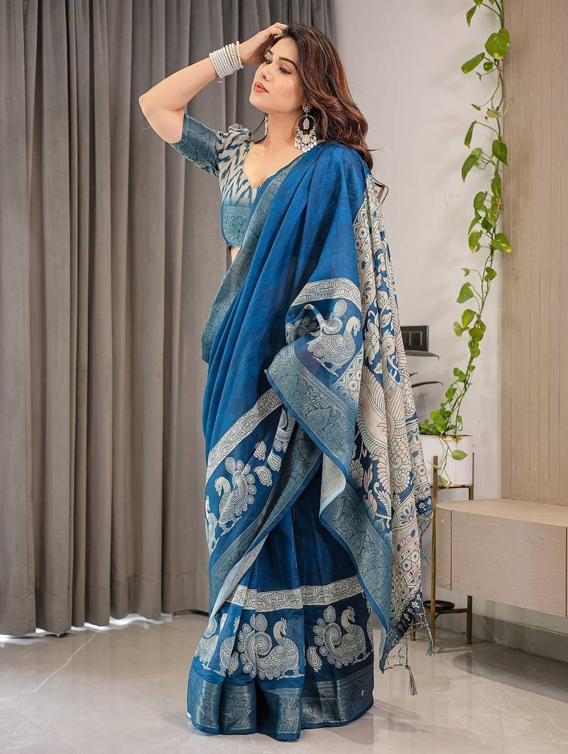 | Product Description | Embrace Effortless Elegance With This Handloom Linen Weaved With Golden Zari Floral Printed Saree, Crafted To Bring Together Heritage Artistry And Modern Comfort. Made From Premium Handloom Linen Weaved With Golden Zari, This Saree Showcases Delicate Floral Digital Prints That Bloom Across The Fabric With A Soft, Artistic Touch. Edged With Playful Tassels On The Pallu, It Adds A Charming Flair That Complements Both Casual And Festive Occasions. The Breathable And Lightweight Texture Of Pure Handloom Linen Weaved With Golden Zari Ensures All Day Comfort, Especially In Warmer Climates. Whether You're Attending A Daytime Celebration, Festive Gathering, Cultural Event, Or Even A Sophisticated Work Meeting, This Saree Offers The Perfect Blend Of Grace, Comfort, And Style. This Saree Comes With A Coordinated 0.8 Meter Attached Blouse Piece, Designed To Complement The Floral Motif And Complete Your Ethnic Look. Why Choose Handloom Linen Weaved With Golden Zari Sarees? 🌿 Eco Friendly & Skin Friendly: Linen Weaved With Golden Zari Is A Natural Fiber That's Gentle On The Skin And Kind To The Planet. 🌸 Timeless Aesthetic: Handloom Weave Adds A Rich, Artisanal Touch To The Fabric, Making Each Piece Unique. ☀️ Ideal For All Seasons: The Fabric Is Breathable In Summer And Warm In Winter, Making It A Versatile Wardrobe Staple. 🎨 Digitally Printed Florals: Artistic Prints Bring A Refreshing, Youthful Vibe To Traditional Wear. Where To Wear: ✅ Festive Functions & Poojas ✅ Ethnic Day At Office Or Colleges ✅ Family Gatherings & Cultural Programs ✅ Summer Weddings, Sangeet & Haldi Events ✅ Casual Brunches And Saree Meet Ups Product Highlights: Fabric: Pure Handloom Linen Weaved With Golden Zari Design: Digital Floral Print With Tassels On Pallu Saree Length: 5.5 Meters Blouse Piece: 0.8 Meter Unstitched (Attached) Comfort Level: Lightweight, Breathable, And Soft On Skin Care: Dry Clean Or Gentle Hand Wash For Longer Durability Style Tip: