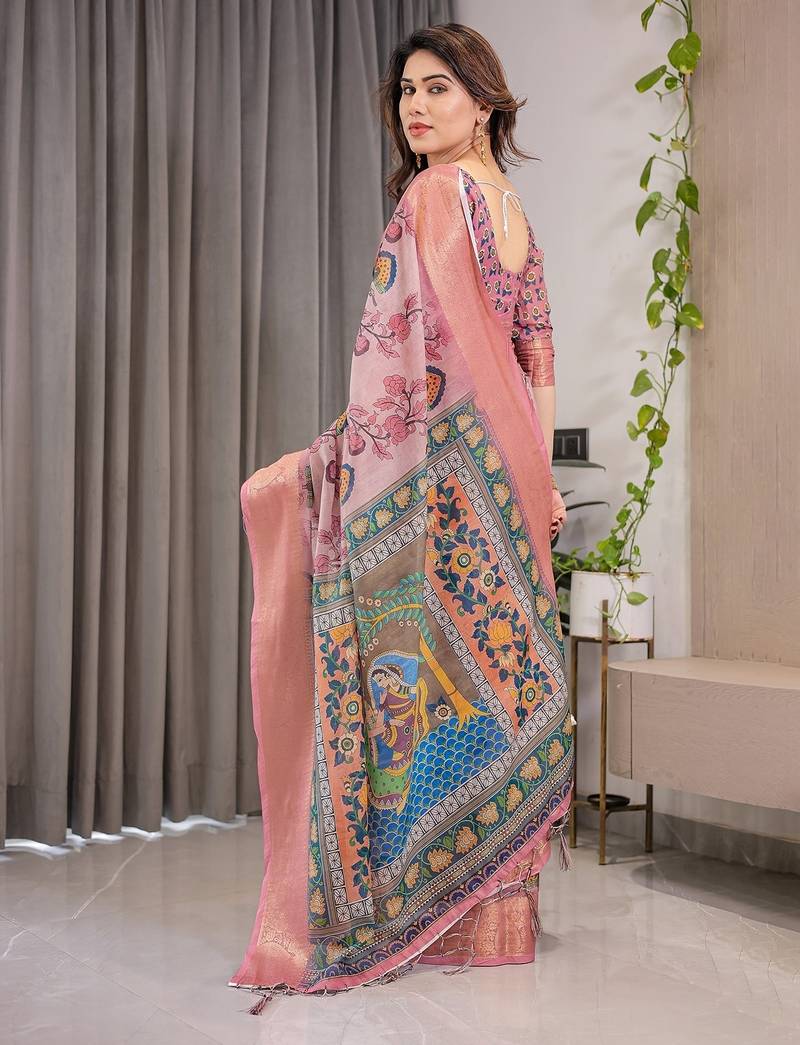 | Product Description | Embrace Effortless Elegance With This Handloom Linen Weaved With Golden Zari Floral Printed Saree, Crafted To Bring Together Heritage Artistry And Modern Comfort. Made From Premium Handloom Linen Weaved With Golden Zari, This Saree Showcases Delicate Floral Digital Prints That Bloom Across The Fabric With A Soft, Artistic Touch. Edged With Playful Tassels On The Pallu, It Adds A Charming Flair That Complements Both Casual And Festive Occasions. The Breathable And Lightweight Texture Of Pure Handloom Linen Weaved With Golden Zari Ensures All Day Comfort, Especially In Warmer Climates. Whether You're Attending A Daytime Celebration, Festive Gathering, Cultural Event, Or Even A Sophisticated Work Meeting, This Saree Offers The Perfect Blend Of Grace, Comfort, And Style. This Saree Comes With A Coordinated 0.8 Meter Attached Blouse Piece, Designed To Complement The Floral Motif And Complete Your Ethnic Look. Why Choose Handloom Linen Weaved With Golden Zari Sarees? 🌿 Eco Friendly & Skin Friendly: Linen Weaved With Golden Zari Is A Natural Fiber That's Gentle On The Skin And Kind To The Planet. 🌸 Timeless Aesthetic: Handloom Weave Adds A Rich, Artisanal Touch To The Fabric, Making Each Piece Unique. ☀️ Ideal For All Seasons: The Fabric Is Breathable In Summer And Warm In Winter, Making It A Versatile Wardrobe Staple. 🎨 Digitally Printed Florals: Artistic Prints Bring A Refreshing, Youthful Vibe To Traditional Wear. Where To Wear: ✅ Festive Functions & Poojas ✅ Ethnic Day At Office Or Colleges ✅ Family Gatherings & Cultural Programs ✅ Summer Weddings, Sangeet & Haldi Events ✅ Casual Brunches And Saree Meet Ups Product Highlights: Fabric: Pure Handloom Linen Weaved With Golden Zari Design: Digital Floral Print With Tassels On Pallu Saree Length: 5.5 Meters Blouse Piece: 0.8 Meter Unstitched (Attached) Comfort Level: Lightweight, Breathable, And Soft On Skin Care: Dry Clean Or Gentle Hand Wash For Longer Durability Style Tip: