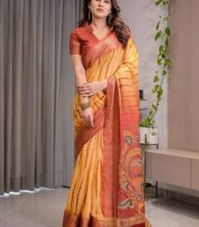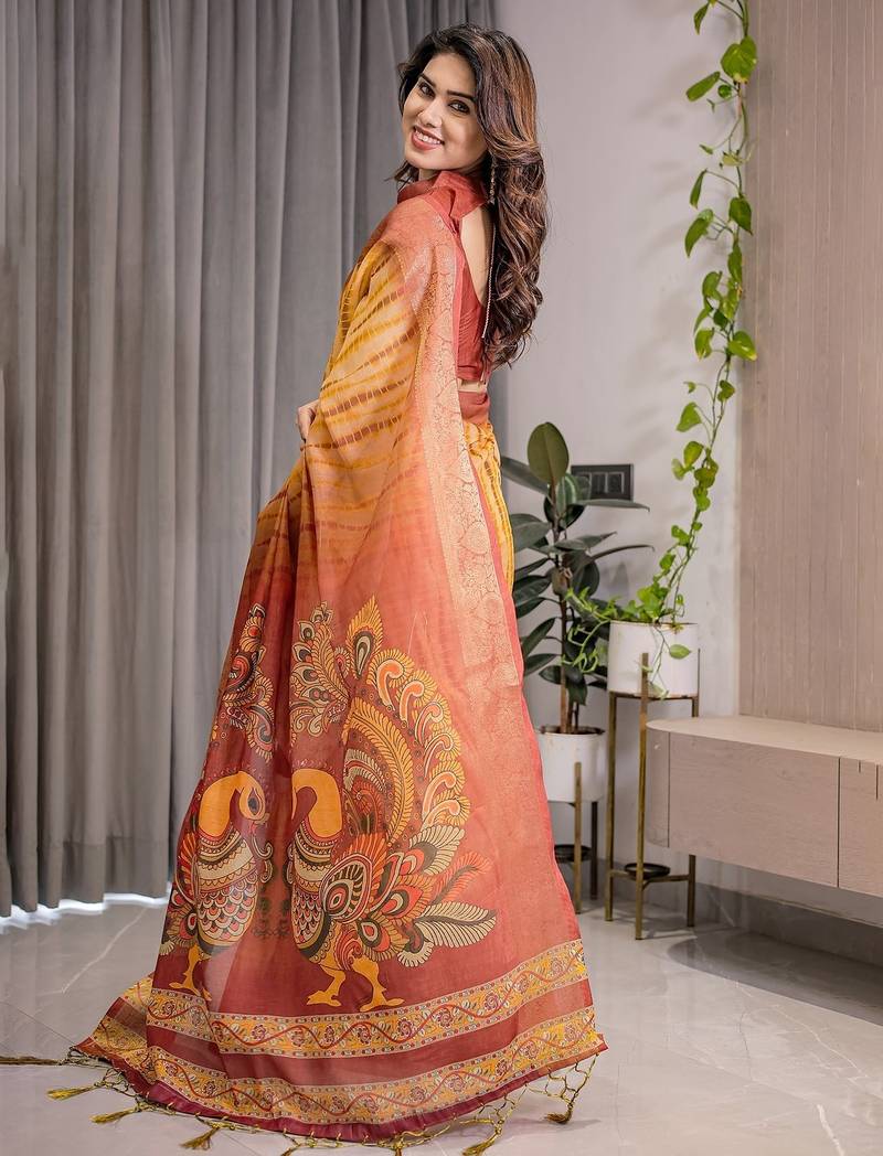 | Product Description | Embrace Effortless Elegance With This Handloom Linen Weaved With Golden Zari Floral Printed Saree, Crafted To Bring Together Heritage Artistry And Modern Comfort. Made From Premium Handloom Linen Weaved With Golden Zari, This Saree Showcases Delicate Floral Digital Prints That Bloom Across The Fabric With A Soft, Artistic Touch. Edged With Playful Tassels On The Pallu, It Adds A Charming Flair That Complements Both Casual And Festive Occasions. The Breathable And Lightweight Texture Of Pure Handloom Linen Weaved With Golden Zari Ensures All Day Comfort, Especially In Warmer Climates. Whether You're Attending A Daytime Celebration, Festive Gathering, Cultural Event, Or Even A Sophisticated Work Meeting, This Saree Offers The Perfect Blend Of Grace, Comfort, And Style. This Saree Comes With A Coordinated 0.8 Meter Attached Blouse Piece, Designed To Complement The Floral Motif And Complete Your Ethnic Look. Why Choose Handloom Linen Weaved With Golden Zari Sarees? 🌿 Eco Friendly & Skin Friendly: Linen Weaved With Golden Zari Is A Natural Fiber That's Gentle On The Skin And Kind To The Planet. 🌸 Timeless Aesthetic: Handloom Weave Adds A Rich, Artisanal Touch To The Fabric, Making Each Piece Unique. ☀️ Ideal For All Seasons: The Fabric Is Breathable In Summer And Warm In Winter, Making It A Versatile Wardrobe Staple. 🎨 Digitally Printed Florals: Artistic Prints Bring A Refreshing, Youthful Vibe To Traditional Wear. Where To Wear: ✅ Festive Functions & Poojas ✅ Ethnic Day At Office Or Colleges ✅ Family Gatherings & Cultural Programs ✅ Summer Weddings, Sangeet & Haldi Events ✅ Casual Brunches And Saree Meet Ups Product Highlights: Fabric: Pure Handloom Linen Weaved With Golden Zari Design: Digital Floral Print With Tassels On Pallu Saree Length: 5.5 Meters Blouse Piece: 0.8 Meter Unstitched (Attached) Comfort Level: Lightweight, Breathable, And Soft On Skin Care: Dry Clean Or Gentle Hand Wash For Longer Durability Style Tip: