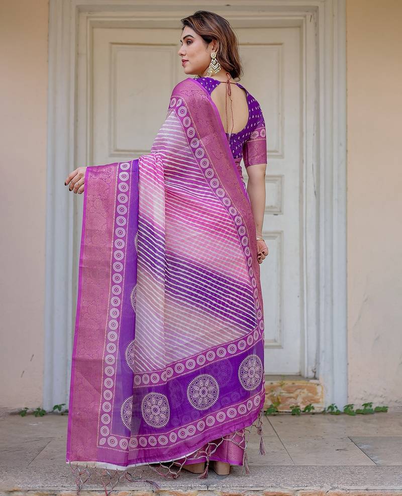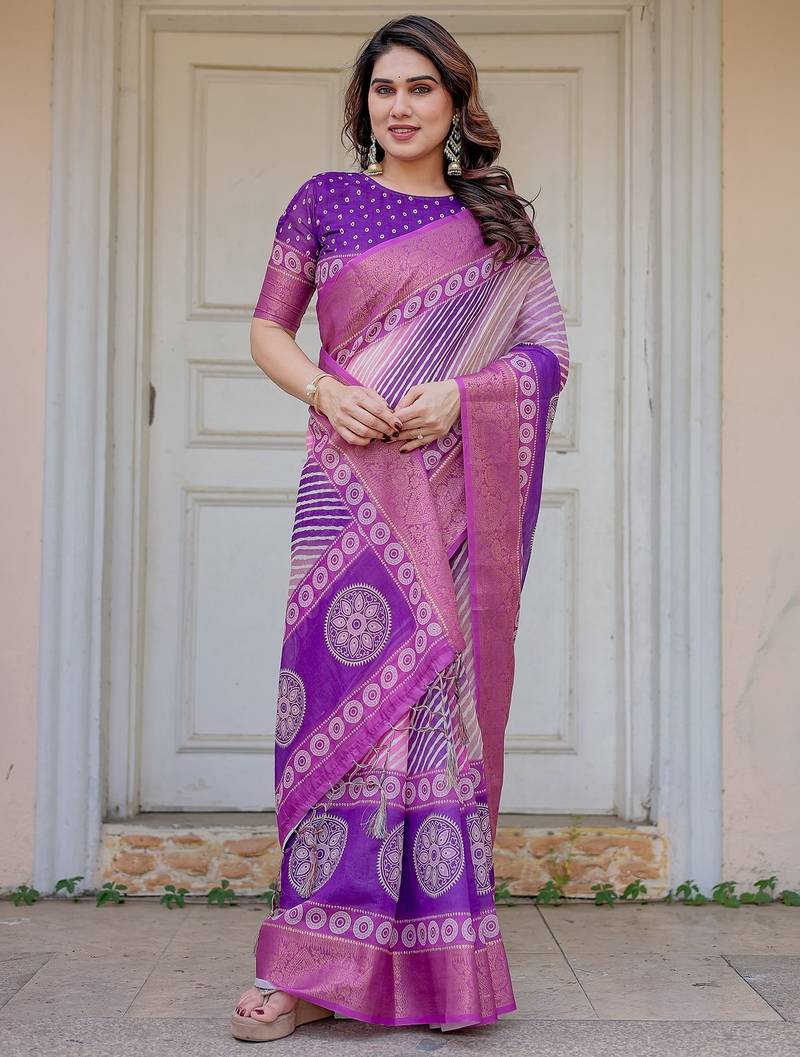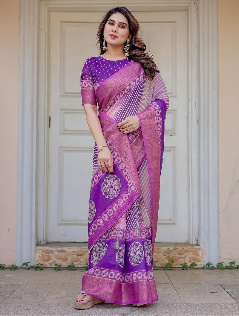 | Product Description | Embrace Effortless Elegance With This Handloom Linen Weaved With Golden Zari Floral Printed Saree, Crafted To Bring Together Heritage Artistry And Modern Comfort. Made From Premium Handloom Linen Weaved With Golden Zari, This Saree Showcases Delicate Floral Digital Prints That Bloom Across The Fabric With A Soft, Artistic Touch. Edged With Playful Tassels On The Pallu, It Adds A Charming Flair That Complements Both Casual And Festive Occasions. The Breathable And Lightweight Texture Of Pure Handloom Linen Weaved With Golden Zari Ensures All Day Comfort, Especially In Warmer Climates. Whether You're Attending A Daytime Celebration, Festive Gathering, Cultural Event, Or Even A Sophisticated Work Meeting, This Saree Offers The Perfect Blend Of Grace, Comfort, And Style. This Saree Comes With A Coordinated 0.8 Meter Attached Blouse Piece, Designed To Complement The Floral Motif And Complete Your Ethnic Look. Why Choose Handloom Linen Weaved With Golden Zari Sarees? 🌿 Eco Friendly & Skin Friendly: Linen Weaved With Golden Zari Is A Natural Fiber That's Gentle On The Skin And Kind To The Planet. 🌸 Timeless Aesthetic: Handloom Weave Adds A Rich, Artisanal Touch To The Fabric, Making Each Piece Unique. ☀️ Ideal For All Seasons: The Fabric Is Breathable In Summer And Warm In Winter, Making It A Versatile Wardrobe Staple. 🎨 Digitally Printed Florals: Artistic Prints Bring A Refreshing, Youthful Vibe To Traditional Wear. Where To Wear: ✅ Festive Functions & Poojas ✅ Ethnic Day At Office Or Colleges ✅ Family Gatherings & Cultural Programs ✅ Summer Weddings, Sangeet & Haldi Events ✅ Casual Brunches And Saree Meet Ups Product Highlights: Fabric: Pure Handloom Linen Weaved With Golden Zari Design: Digital Floral Print With Tassels On Pallu Saree Length: 5.5 Meters Blouse Piece: 0.8 Meter Unstitched (Attached) Comfort Level: Lightweight, Breathable, And Soft On Skin Care: Dry Clean Or Gentle Hand Wash For Longer Durability Style Tip: