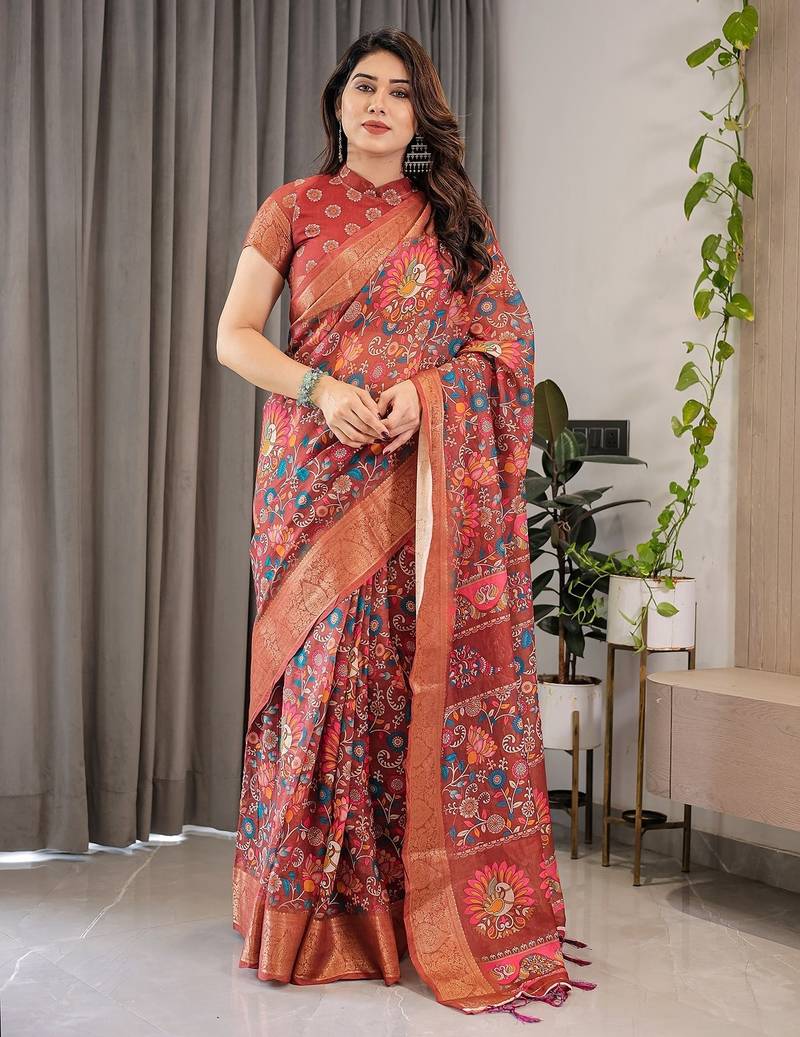| Product Description | Embrace Effortless Elegance With This Handloom Linen Weaved With Golden Zari Floral Printed Saree, Crafted To Bring Together Heritage Artistry And Modern Comfort. Made From Premium Handloom Linen Weaved With Golden Zari, This Saree Showcases Delicate Floral Digital Prints That Bloom Across The Fabric With A Soft, Artistic Touch. Edged With Playful Tassels On The Pallu, It Adds A Charming Flair That Complements Both Casual And Festive Occasions. The Breathable And Lightweight Texture Of Pure Handloom Linen Weaved With Golden Zari Ensures All Day Comfort, Especially In Warmer Climates. Whether You're Attending A Daytime Celebration, Festive Gathering, Cultural Event, Or Even A Sophisticated Work Meeting, This Saree Offers The Perfect Blend Of Grace, Comfort, And Style. This Saree Comes With A Coordinated 0.8 Meter Attached Blouse Piece, Designed To Complement The Floral Motif And Complete Your Ethnic Look. Why Choose Handloom Linen Weaved With Golden Zari Sarees? 🌿 Eco Friendly & Skin Friendly: Linen Weaved With Golden Zari Is A Natural Fiber That's Gentle On The Skin And Kind To The Planet. 🌸 Timeless Aesthetic: Handloom Weave Adds A Rich, Artisanal Touch To The Fabric, Making Each Piece Unique. ☀️ Ideal For All Seasons: The Fabric Is Breathable In Summer And Warm In Winter, Making It A Versatile Wardrobe Staple. 🎨 Digitally Printed Florals: Artistic Prints Bring A Refreshing, Youthful Vibe To Traditional Wear. Where To Wear: ✅ Festive Functions & Poojas ✅ Ethnic Day At Office Or Colleges ✅ Family Gatherings & Cultural Programs ✅ Summer Weddings, Sangeet & Haldi Events ✅ Casual Brunches And Saree Meet Ups Product Highlights: Fabric: Pure Handloom Linen Weaved With Golden Zari Design: Digital Floral Print With Tassels On Pallu Saree Length: 5.5 Meters Blouse Piece: 0.8 Meter Unstitched (Attached) Comfort Level: Lightweight, Breathable, And Soft On Skin Care: Dry Clean Or Gentle Hand Wash For Longer Durability Style Tip: