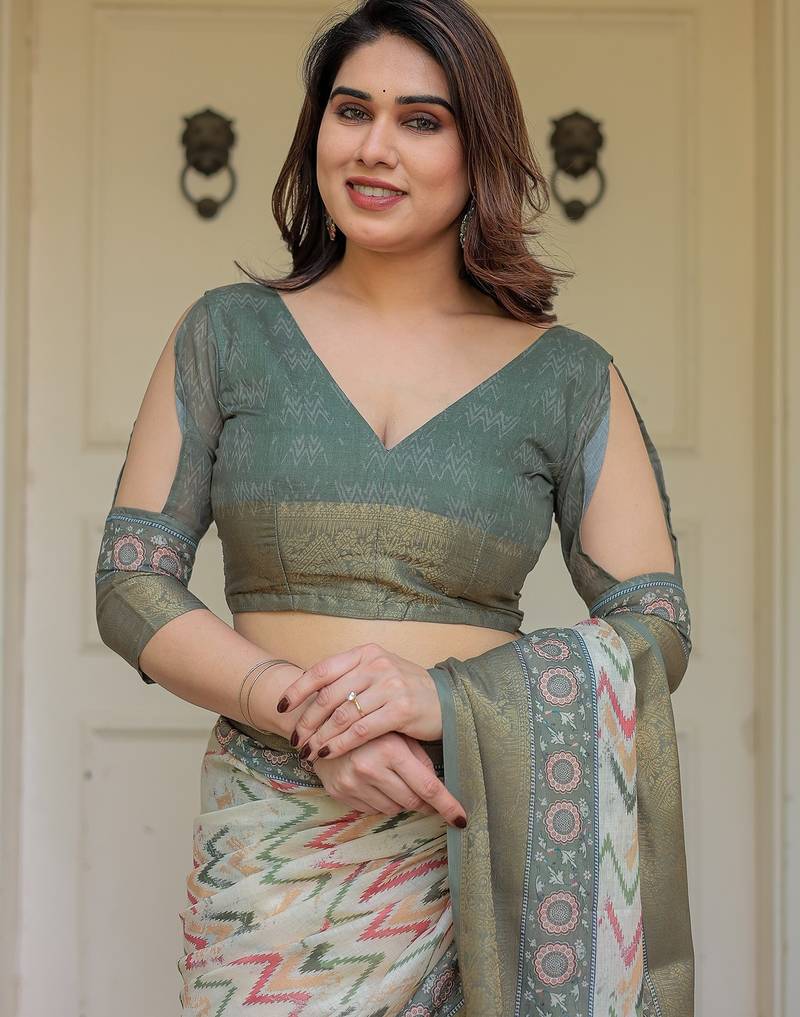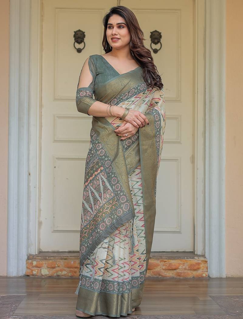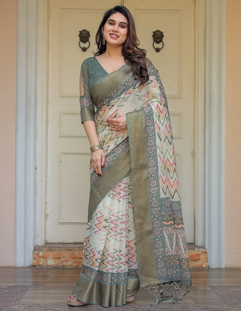 | Product Description | Embrace Effortless Elegance With This Handloom Linen Weaved With Golden Zari Floral Printed Saree, Crafted To Bring Together Heritage Artistry And Modern Comfort. Made From Premium Handloom Linen Weaved With Golden Zari, This Saree Showcases Delicate Floral Digital Prints That Bloom Across The Fabric With A Soft, Artistic Touch. Edged With Playful Tassels On The Pallu, It Adds A Charming Flair That Complements Both Casual And Festive Occasions. The Breathable And Lightweight Texture Of Pure Handloom Linen Weaved With Golden Zari Ensures All Day Comfort, Especially In Warmer Climates. Whether You're Attending A Daytime Celebration, Festive Gathering, Cultural Event, Or Even A Sophisticated Work Meeting, This Saree Offers The Perfect Blend Of Grace, Comfort, And Style. This Saree Comes With A Coordinated 0.8 Meter Attached Blouse Piece, Designed To Complement The Floral Motif And Complete Your Ethnic Look. Why Choose Handloom Linen Weaved With Golden Zari Sarees? 🌿 Eco Friendly & Skin Friendly: Linen Weaved With Golden Zari Is A Natural Fiber That's Gentle On The Skin And Kind To The Planet. 🌸 Timeless Aesthetic: Handloom Weave Adds A Rich, Artisanal Touch To The Fabric, Making Each Piece Unique. ☀️ Ideal For All Seasons: The Fabric Is Breathable In Summer And Warm In Winter, Making It A Versatile Wardrobe Staple. 🎨 Digitally Printed Florals: Artistic Prints Bring A Refreshing, Youthful Vibe To Traditional Wear. Where To Wear: ✅ Festive Functions & Poojas ✅ Ethnic Day At Office Or Colleges ✅ Family Gatherings & Cultural Programs ✅ Summer Weddings, Sangeet & Haldi Events ✅ Casual Brunches And Saree Meet Ups Product Highlights: Fabric: Pure Handloom Linen Weaved With Golden Zari Design: Digital Floral Print With Tassels On Pallu Saree Length: 5.5 Meters Blouse Piece: 0.8 Meter Unstitched (Attached) Comfort Level: Lightweight, Breathable, And Soft On Skin Care: Dry Clean Or Gentle Hand Wash For Longer Durability Style Tip: