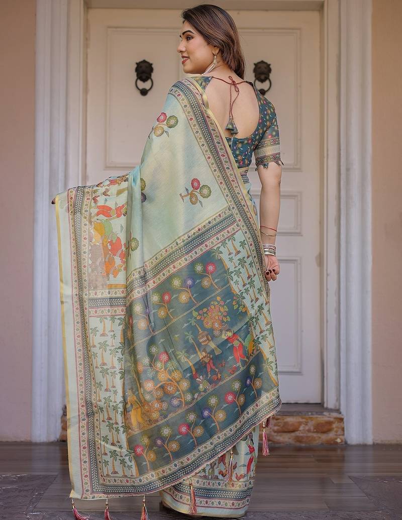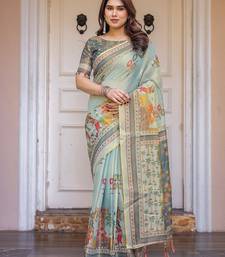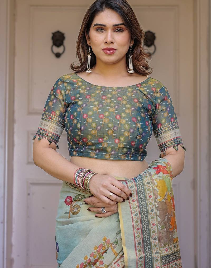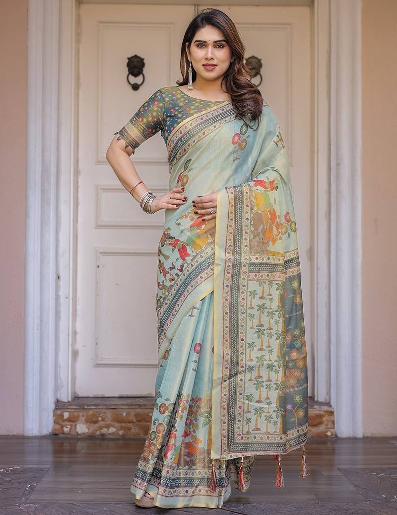 | Product Description | Embrace Effortless Elegance With This Handloom Linen Weaved With Golden Zari Floral Printed Saree, Crafted To Bring Together Heritage Artistry And Modern Comfort. Made From Premium Handloom Linen Weaved With Golden Zari, This Saree Showcases Delicate Floral Digital Prints That Bloom Across The Fabric With A Soft, Artistic Touch. Edged With Playful Tassels On The Pallu, It Adds A Charming Flair That Complements Both Casual And Festive Occasions. The Breathable And Lightweight Texture Of Pure Handloom Linen Weaved With Golden Zari Ensures All Day Comfort, Especially In Warmer Climates. Whether You're Attending A Daytime Celebration, Festive Gathering, Cultural Event, Or Even A Sophisticated Work Meeting, This Saree Offers The Perfect Blend Of Grace, Comfort, And Style. This Saree Comes With A Coordinated 0.8 Meter Attached Blouse Piece, Designed To Complement The Floral Motif And Complete Your Ethnic Look. Why Choose Handloom Linen Weaved With Golden Zari Sarees? 🌿 Eco Friendly & Skin Friendly: Linen Weaved With Golden Zari Is A Natural Fiber That's Gentle On The Skin And Kind To The Planet. 🌸 Timeless Aesthetic: Handloom Weave Adds A Rich, Artisanal Touch To The Fabric, Making Each Piece Unique. ☀️ Ideal For All Seasons: The Fabric Is Breathable In Summer And Warm In Winter, Making It A Versatile Wardrobe Staple. 🎨 Digitally Printed Florals: Artistic Prints Bring A Refreshing, Youthful Vibe To Traditional Wear. Where To Wear: ✅ Festive Functions & Poojas ✅ Ethnic Day At Office Or Colleges ✅ Family Gatherings & Cultural Programs ✅ Summer Weddings, Sangeet & Haldi Events ✅ Casual Brunches And Saree Meet Ups Product Highlights: Fabric: Pure Handloom Linen Weaved With Golden Zari Design: Digital Floral Print With Tassels On Pallu Saree Length: 5.5 Meters Blouse Piece: 0.8 Meter Unstitched (Attached) Comfort Level: Lightweight, Breathable, And Soft On Skin Care: Dry Clean Or Gentle Hand Wash For Longer Durability Style Tip: