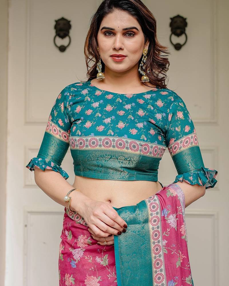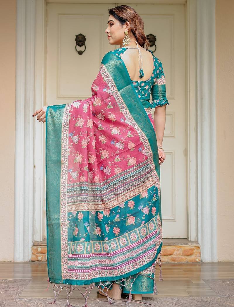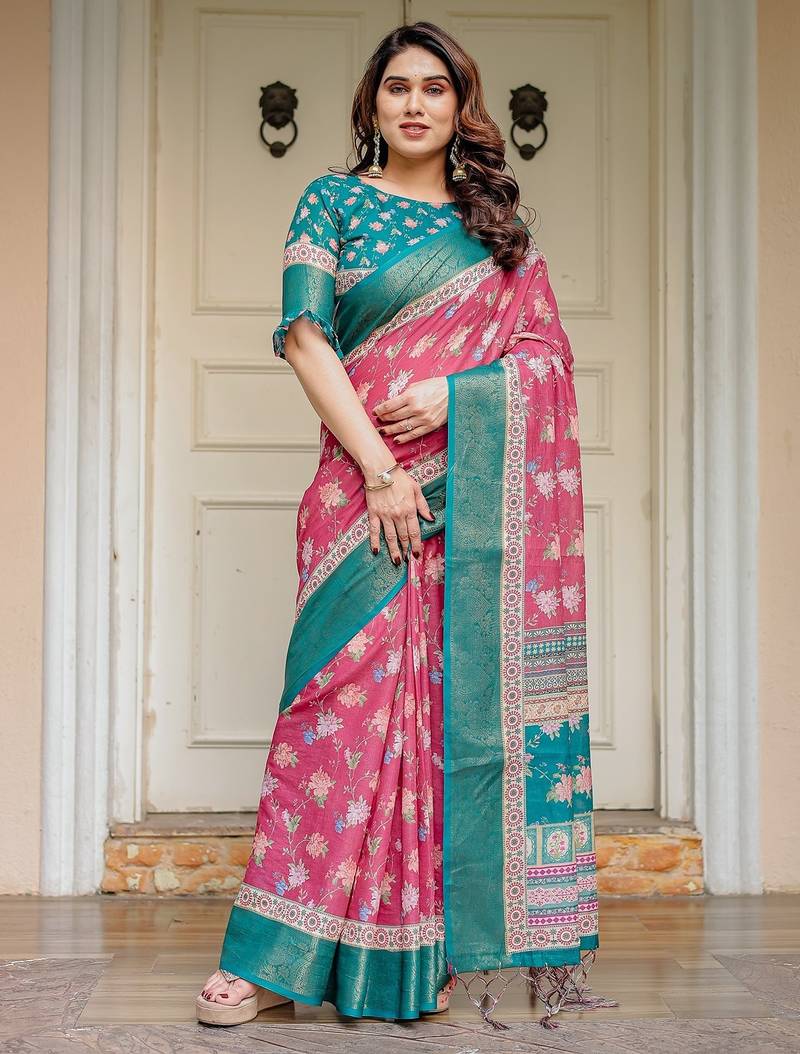 | Product Description | Embrace Effortless Elegance With This Handloom Linen Weaved With Golden Zari Floral Printed Saree, Crafted To Bring Together Heritage Artistry And Modern Comfort. Made From Premium Handloom Linen Weaved With Golden Zari, This Saree Showcases Delicate Floral Digital Prints That Bloom Across The Fabric With A Soft, Artistic Touch. Edged With Playful Tassels On The Pallu, It Adds A Charming Flair That Complements Both Casual And Festive Occasions. The Breathable And Lightweight Texture Of Pure Handloom Linen Weaved With Golden Zari Ensures All Day Comfort, Especially In Warmer Climates. Whether You're Attending A Daytime Celebration, Festive Gathering, Cultural Event, Or Even A Sophisticated Work Meeting, This Saree Offers The Perfect Blend Of Grace, Comfort, And Style. This Saree Comes With A Coordinated 0.8 Meter Attached Blouse Piece, Designed To Complement The Floral Motif And Complete Your Ethnic Look. Why Choose Handloom Linen Weaved With Golden Zari Sarees? 🌿 Eco Friendly & Skin Friendly: Linen Weaved With Golden Zari Is A Natural Fiber That's Gentle On The Skin And Kind To The Planet. 🌸 Timeless Aesthetic: Handloom Weave Adds A Rich, Artisanal Touch To The Fabric, Making Each Piece Unique. ☀️ Ideal For All Seasons: The Fabric Is Breathable In Summer And Warm In Winter, Making It A Versatile Wardrobe Staple. 🎨 Digitally Printed Florals: Artistic Prints Bring A Refreshing, Youthful Vibe To Traditional Wear. Where To Wear: ✅ Festive Functions & Poojas ✅ Ethnic Day At Office Or Colleges ✅ Family Gatherings & Cultural Programs ✅ Summer Weddings, Sangeet & Haldi Events ✅ Casual Brunches And Saree Meet Ups Product Highlights: Fabric: Pure Handloom Linen Weaved With Golden Zari Design: Digital Floral Print With Tassels On Pallu Saree Length: 5.5 Meters Blouse Piece: 0.8 Meter Unstitched (Attached) Comfort Level: Lightweight, Breathable, And Soft On Skin Care: Dry Clean Or Gentle Hand Wash For Longer Durability Style Tip: