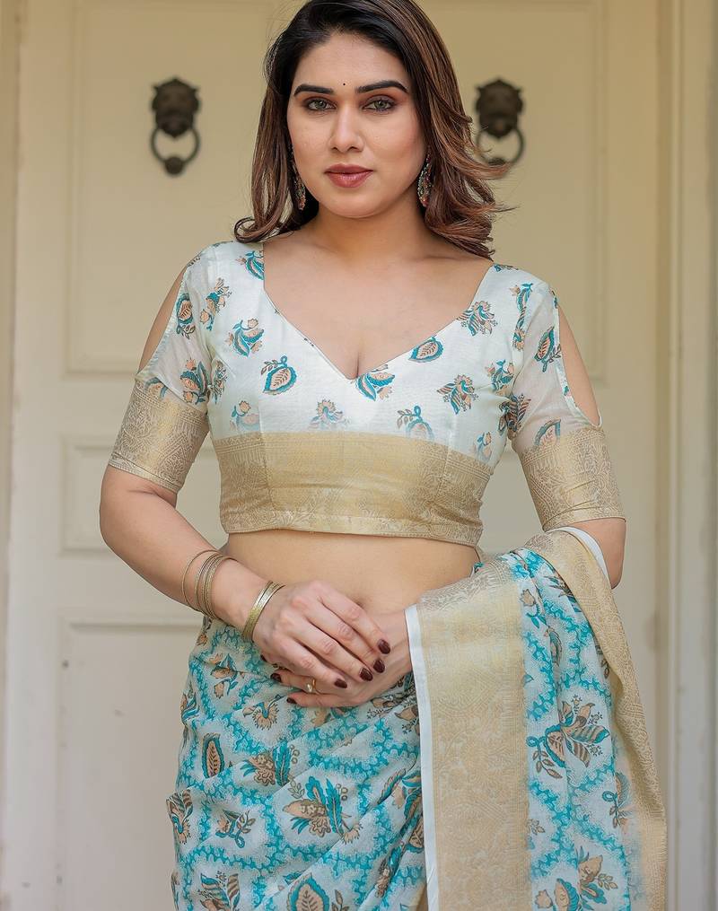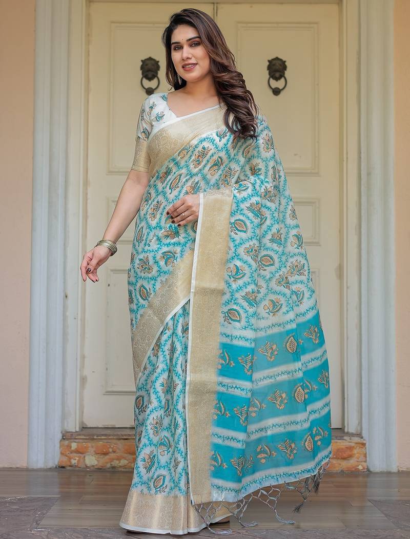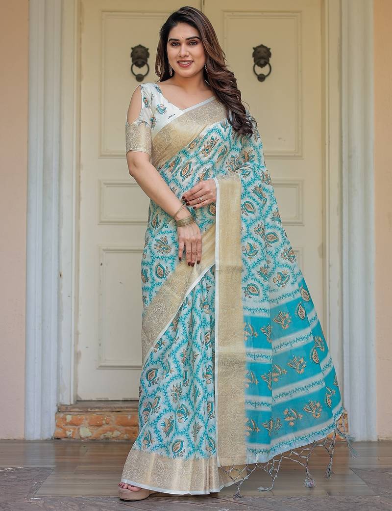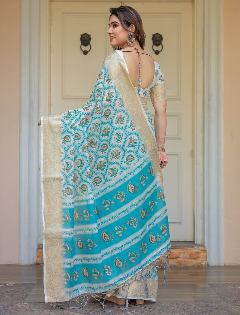 | Product Description | Embrace Effortless Elegance With This Handloom Linen Weaved With Golden Zari Floral Printed Saree, Crafted To Bring Together Heritage Artistry And Modern Comfort. Made From Premium Handloom Linen Weaved With Golden Zari, This Saree Showcases Delicate Floral Digital Prints That Bloom Across The Fabric With A Soft, Artistic Touch. Edged With Playful Tassels On The Pallu, It Adds A Charming Flair That Complements Both Casual And Festive Occasions. The Breathable And Lightweight Texture Of Pure Handloom Linen Weaved With Golden Zari Ensures All Day Comfort, Especially In Warmer Climates. Whether You're Attending A Daytime Celebration, Festive Gathering, Cultural Event, Or Even A Sophisticated Work Meeting, This Saree Offers The Perfect Blend Of Grace, Comfort, And Style. This Saree Comes With A Coordinated 0.8 Meter Attached Blouse Piece, Designed To Complement The Floral Motif And Complete Your Ethnic Look. Why Choose Handloom Linen Weaved With Golden Zari Sarees? 🌿 Eco Friendly & Skin Friendly: Linen Weaved With Golden Zari Is A Natural Fiber That's Gentle On The Skin And Kind To The Planet. 🌸 Timeless Aesthetic: Handloom Weave Adds A Rich, Artisanal Touch To The Fabric, Making Each Piece Unique. ☀️ Ideal For All Seasons: The Fabric Is Breathable In Summer And Warm In Winter, Making It A Versatile Wardrobe Staple. 🎨 Digitally Printed Florals: Artistic Prints Bring A Refreshing, Youthful Vibe To Traditional Wear. Where To Wear: ✅ Festive Functions & Poojas ✅ Ethnic Day At Office Or Colleges ✅ Family Gatherings & Cultural Programs ✅ Summer Weddings, Sangeet & Haldi Events ✅ Casual Brunches And Saree Meet Ups Product Highlights: Fabric: Pure Handloom Linen Weaved With Golden Zari Design: Digital Floral Print With Tassels On Pallu Saree Length: 5.5 Meters Blouse Piece: 0.8 Meter Unstitched (Attached) Comfort Level: Lightweight, Breathable, And Soft On Skin Care: Dry Clean Or Gentle Hand Wash For Longer Durability Style Tip: