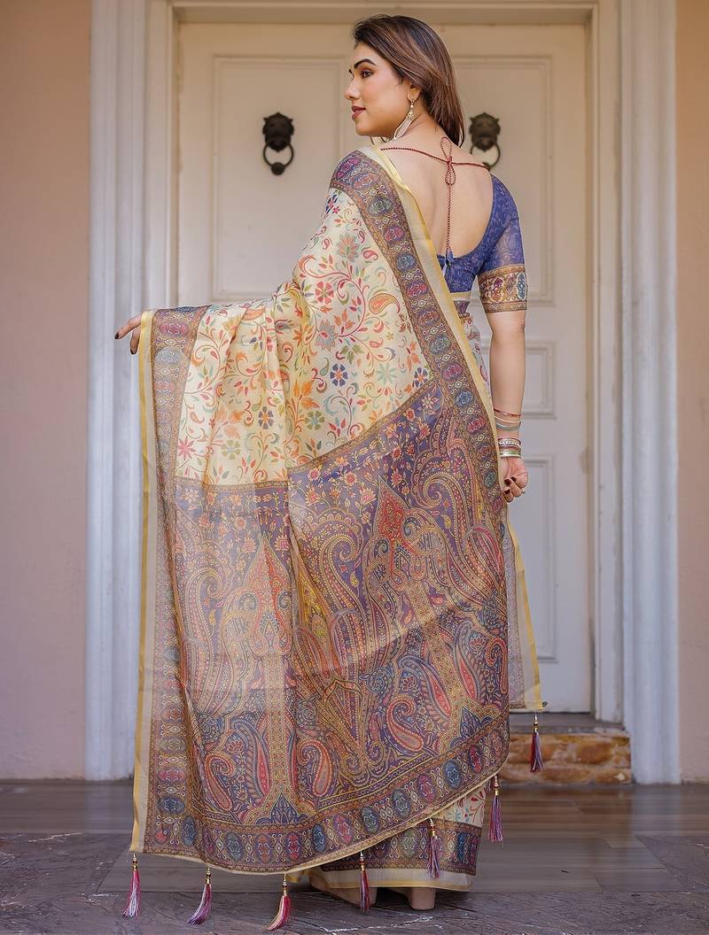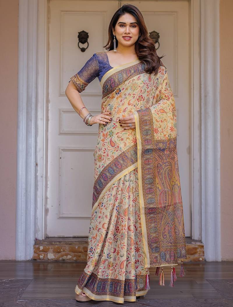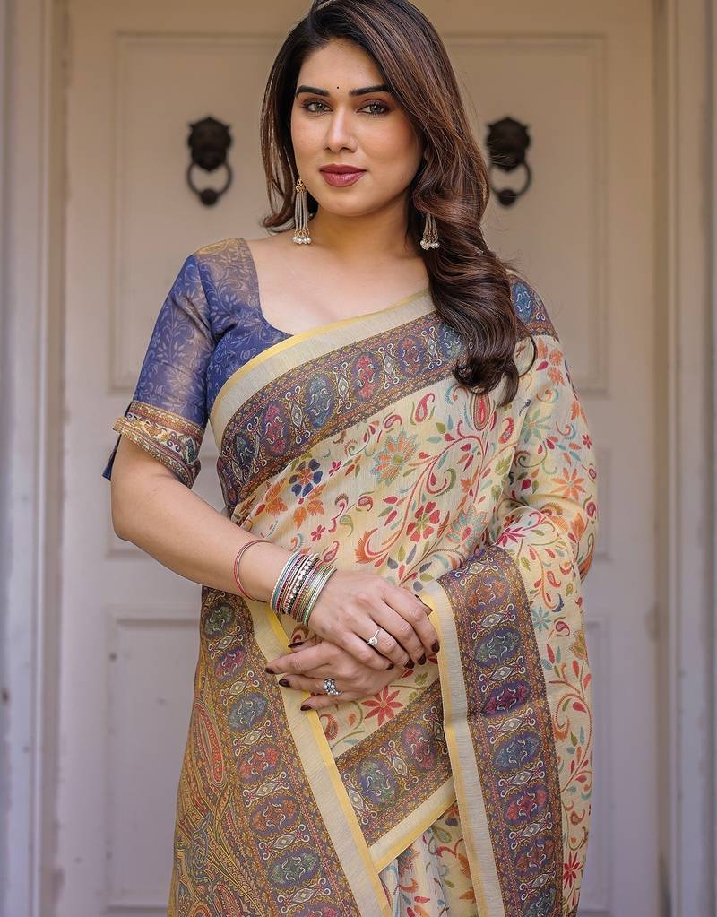 | Product Description | Embrace Effortless Elegance With This Handloom Linen Weaved With Golden Zari Floral Printed Saree, Crafted To Bring Together Heritage Artistry And Modern Comfort. Made From Premium Handloom Linen Weaved With Golden Zari, This Saree Showcases Delicate Floral Digital Prints That Bloom Across The Fabric With A Soft, Artistic Touch. Edged With Playful Tassels On The Pallu, It Adds A Charming Flair That Complements Both Casual And Festive Occasions. The Breathable And Lightweight Texture Of Pure Handloom Linen Weaved With Golden Zari Ensures All Day Comfort, Especially In Warmer Climates. Whether You're Attending A Daytime Celebration, Festive Gathering, Cultural Event, Or Even A Sophisticated Work Meeting, This Saree Offers The Perfect Blend Of Grace, Comfort, And Style. This Saree Comes With A Coordinated 0.8 Meter Attached Blouse Piece, Designed To Complement The Floral Motif And Complete Your Ethnic Look. Why Choose Handloom Linen Weaved With Golden Zari Sarees? 🌿 Eco Friendly & Skin Friendly: Linen Weaved With Golden Zari Is A Natural Fiber That's Gentle On The Skin And Kind To The Planet. 🌸 Timeless Aesthetic: Handloom Weave Adds A Rich, Artisanal Touch To The Fabric, Making Each Piece Unique. ☀️ Ideal For All Seasons: The Fabric Is Breathable In Summer And Warm In Winter, Making It A Versatile Wardrobe Staple. 🎨 Digitally Printed Florals: Artistic Prints Bring A Refreshing, Youthful Vibe To Traditional Wear. Where To Wear: ✅ Festive Functions & Poojas ✅ Ethnic Day At Office Or Colleges ✅ Family Gatherings & Cultural Programs ✅ Summer Weddings, Sangeet & Haldi Events ✅ Casual Brunches And Saree Meet Ups Product Highlights: Fabric: Pure Handloom Linen Weaved With Golden Zari Design: Digital Floral Print With Tassels On Pallu Saree Length: 5.5 Meters Blouse Piece: 0.8 Meter Unstitched (Attached) Comfort Level: Lightweight, Breathable, And Soft On Skin Care: Dry Clean Or Gentle Hand Wash For Longer Durability Style Tip: