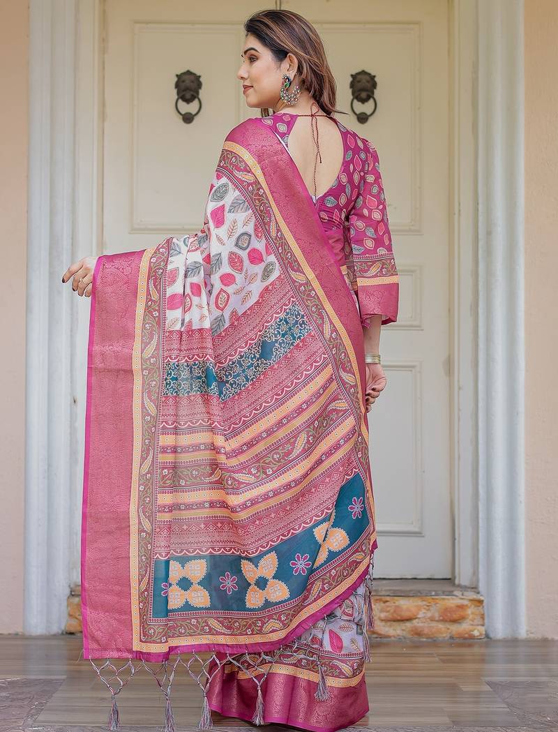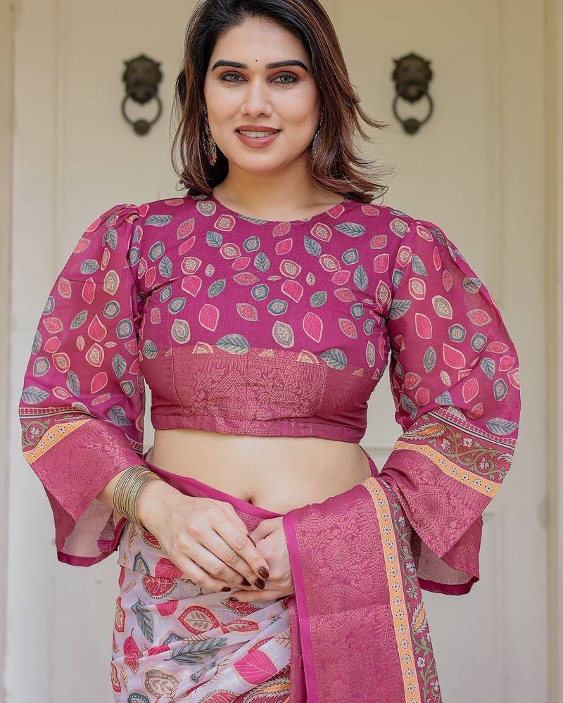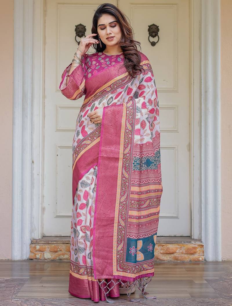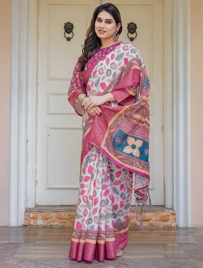 | Product Description | Embrace Effortless Elegance With This Handloom Linen Weaved With Golden Zari Floral Printed Saree, Crafted To Bring Together Heritage Artistry And Modern Comfort. Made From Premium Handloom Linen Weaved With Golden Zari, This Saree Showcases Delicate Floral Digital Prints That Bloom Across The Fabric With A Soft, Artistic Touch. Edged With Playful Tassels On The Pallu, It Adds A Charming Flair That Complements Both Casual And Festive Occasions. The Breathable And Lightweight Texture Of Pure Handloom Linen Weaved With Golden Zari Ensures All Day Comfort, Especially In Warmer Climates. Whether You're Attending A Daytime Celebration, Festive Gathering, Cultural Event, Or Even A Sophisticated Work Meeting, This Saree Offers The Perfect Blend Of Grace, Comfort, And Style. This Saree Comes With A Coordinated 0.8 Meter Attached Blouse Piece, Designed To Complement The Floral Motif And Complete Your Ethnic Look. Why Choose Handloom Linen Weaved With Golden Zari Sarees? 🌿 Eco Friendly & Skin Friendly: Linen Weaved With Golden Zari Is A Natural Fiber That's Gentle On The Skin And Kind To The Planet. 🌸 Timeless Aesthetic: Handloom Weave Adds A Rich, Artisanal Touch To The Fabric, Making Each Piece Unique. ☀️ Ideal For All Seasons: The Fabric Is Breathable In Summer And Warm In Winter, Making It A Versatile Wardrobe Staple. 🎨 Digitally Printed Florals: Artistic Prints Bring A Refreshing, Youthful Vibe To Traditional Wear. Where To Wear: ✅ Festive Functions & Poojas ✅ Ethnic Day At Office Or Colleges ✅ Family Gatherings & Cultural Programs ✅ Summer Weddings, Sangeet & Haldi Events ✅ Casual Brunches And Saree Meet Ups Product Highlights: Fabric: Pure Handloom Linen Weaved With Golden Zari Design: Digital Floral Print With Tassels On Pallu Saree Length: 5.5 Meters Blouse Piece: 0.8 Meter Unstitched (Attached) Comfort Level: Lightweight, Breathable, And Soft On Skin Care: Dry Clean Or Gentle Hand Wash For Longer Durability Style Tip: