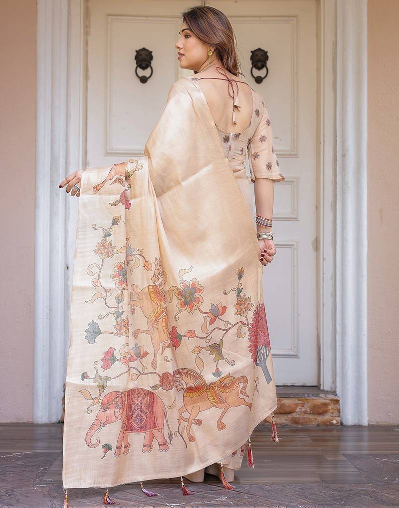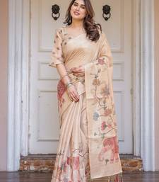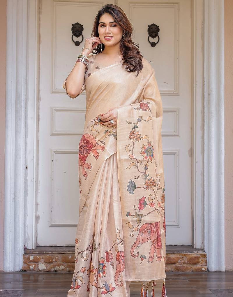 | Product Description | Embrace Effortless Elegance With This Handloom Linen Weaved With Golden Zari Floral Printed Saree, Crafted To Bring Together Heritage Artistry And Modern Comfort. Made From Premium Handloom Linen Weaved With Golden Zari, This Saree Showcases Delicate Floral Digital Prints That Bloom Across The Fabric With A Soft, Artistic Touch. Edged With Playful Tassels On The Pallu, It Adds A Charming Flair That Complements Both Casual And Festive Occasions. The Breathable And Lightweight Texture Of Pure Handloom Linen Weaved With Golden Zari Ensures All Day Comfort, Especially In Warmer Climates. Whether You're Attending A Daytime Celebration, Festive Gathering, Cultural Event, Or Even A Sophisticated Work Meeting, This Saree Offers The Perfect Blend Of Grace, Comfort, And Style. This Saree Comes With A Coordinated 0.8 Meter Attached Blouse Piece, Designed To Complement The Floral Motif And Complete Your Ethnic Look. Why Choose Handloom Linen Weaved With Golden Zari Sarees? 🌿 Eco Friendly & Skin Friendly: Linen Weaved With Golden Zari Is A Natural Fiber That's Gentle On The Skin And Kind To The Planet. 🌸 Timeless Aesthetic: Handloom Weave Adds A Rich, Artisanal Touch To The Fabric, Making Each Piece Unique. ☀️ Ideal For All Seasons: The Fabric Is Breathable In Summer And Warm In Winter, Making It A Versatile Wardrobe Staple. 🎨 Digitally Printed Florals: Artistic Prints Bring A Refreshing, Youthful Vibe To Traditional Wear. Where To Wear: ✅ Festive Functions & Poojas ✅ Ethnic Day At Office Or Colleges ✅ Family Gatherings & Cultural Programs ✅ Summer Weddings, Sangeet & Haldi Events ✅ Casual Brunches And Saree Meet Ups Product Highlights: Fabric: Pure Handloom Linen Weaved With Golden Zari Design: Digital Floral Print With Tassels On Pallu Saree Length: 5.5 Meters Blouse Piece: 0.8 Meter Unstitched (Attached) Comfort Level: Lightweight, Breathable, And Soft On Skin Care: Dry Clean Or Gentle Hand Wash For Longer Durability Style Tip: