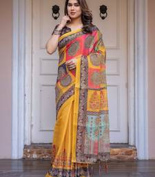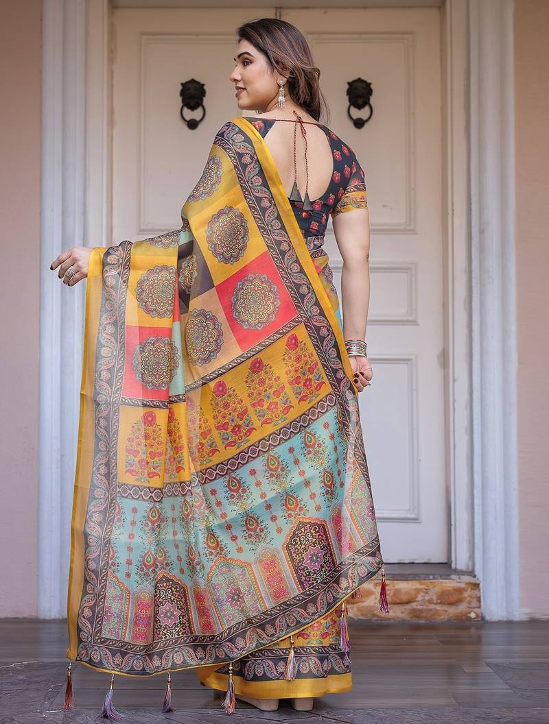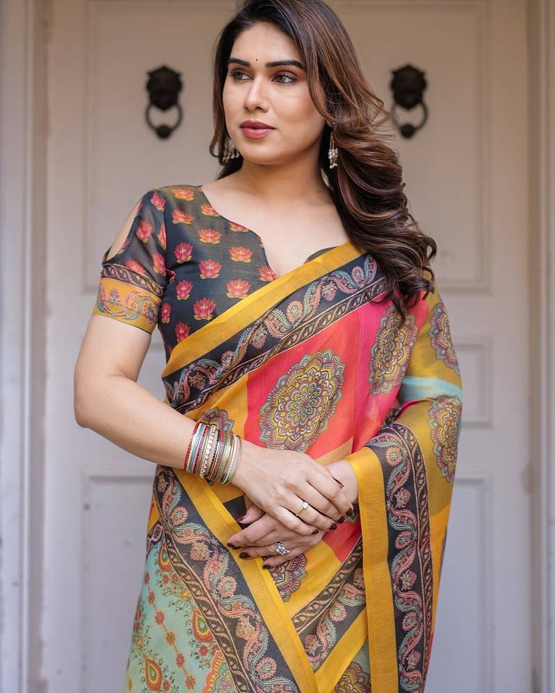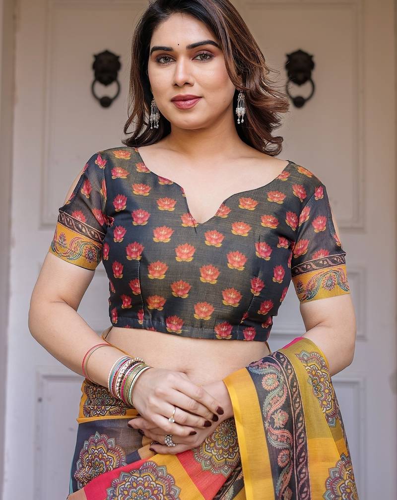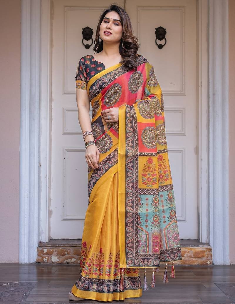 | Product Description | Embrace Effortless Elegance With This Handloom Linen Weaved With Golden Zari Floral Printed Saree, Crafted To Bring Together Heritage Artistry And Modern Comfort. Made From Premium Handloom Linen Weaved With Golden Zari, This Saree Showcases Delicate Floral Digital Prints That Bloom Across The Fabric With A Soft, Artistic Touch. Edged With Playful Tassels On The Pallu, It Adds A Charming Flair That Complements Both Casual And Festive Occasions. The Breathable And Lightweight Texture Of Pure Handloom Linen Weaved With Golden Zari Ensures All Day Comfort, Especially In Warmer Climates. Whether You're Attending A Daytime Celebration, Festive Gathering, Cultural Event, Or Even A Sophisticated Work Meeting, This Saree Offers The Perfect Blend Of Grace, Comfort, And Style. This Saree Comes With A Coordinated 0.8 Meter Attached Blouse Piece, Designed To Complement The Floral Motif And Complete Your Ethnic Look. Why Choose Handloom Linen Weaved With Golden Zari Sarees? 🌿 Eco Friendly & Skin Friendly: Linen Weaved With Golden Zari Is A Natural Fiber That's Gentle On The Skin And Kind To The Planet. 🌸 Timeless Aesthetic: Handloom Weave Adds A Rich, Artisanal Touch To The Fabric, Making Each Piece Unique. ☀️ Ideal For All Seasons: The Fabric Is Breathable In Summer And Warm In Winter, Making It A Versatile Wardrobe Staple. 🎨 Digitally Printed Florals: Artistic Prints Bring A Refreshing, Youthful Vibe To Traditional Wear. Where To Wear: ✅ Festive Functions & Poojas ✅ Ethnic Day At Office Or Colleges ✅ Family Gatherings & Cultural Programs ✅ Summer Weddings, Sangeet & Haldi Events ✅ Casual Brunches And Saree Meet Ups Product Highlights: Fabric: Pure Handloom Linen Weaved With Golden Zari Design: Digital Floral Print With Tassels On Pallu Saree Length: 5.5 Meters Blouse Piece: 0.8 Meter Unstitched (Attached) Comfort Level: Lightweight, Breathable, And Soft On Skin Care: Dry Clean Or Gentle Hand Wash For Longer Durability Style Tip: