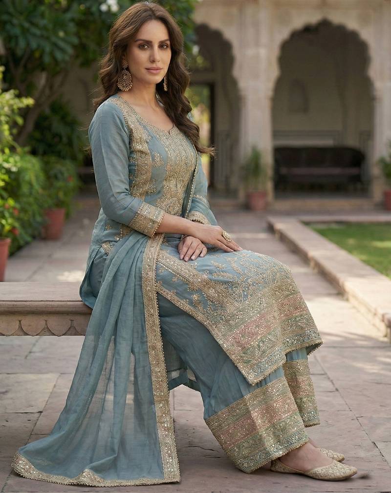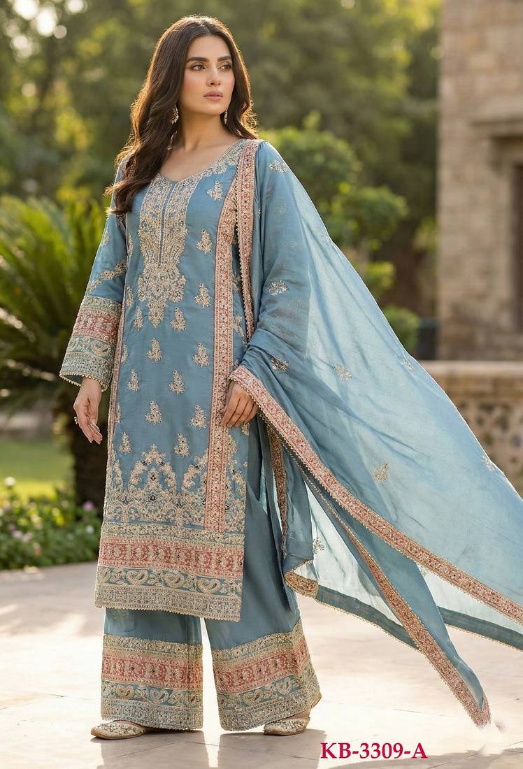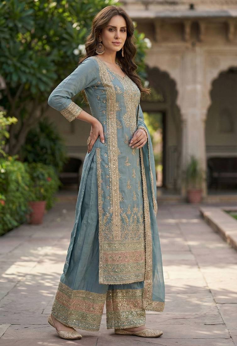 | Product Name | Blue Chinon Semi Stitched Suit With Embroidery & Sequence Work | |