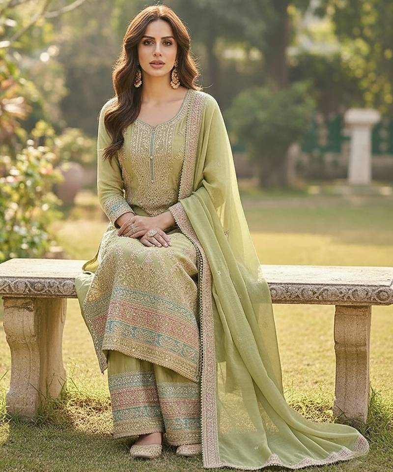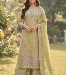 | Product Name | Green Chinon Semi Stitched Suit With Embroidery & Sequence Work | |