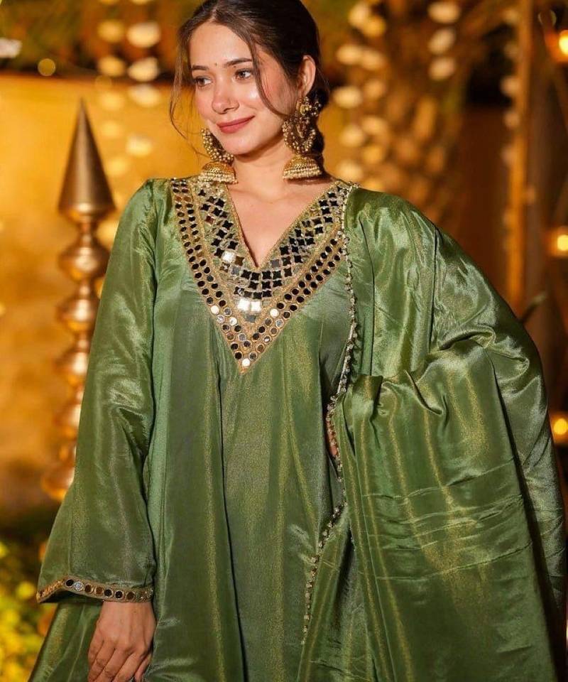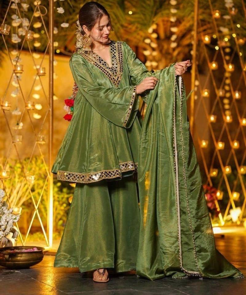| Product Name | Green Silk Readymade Suit With Real Mirror Work | |
