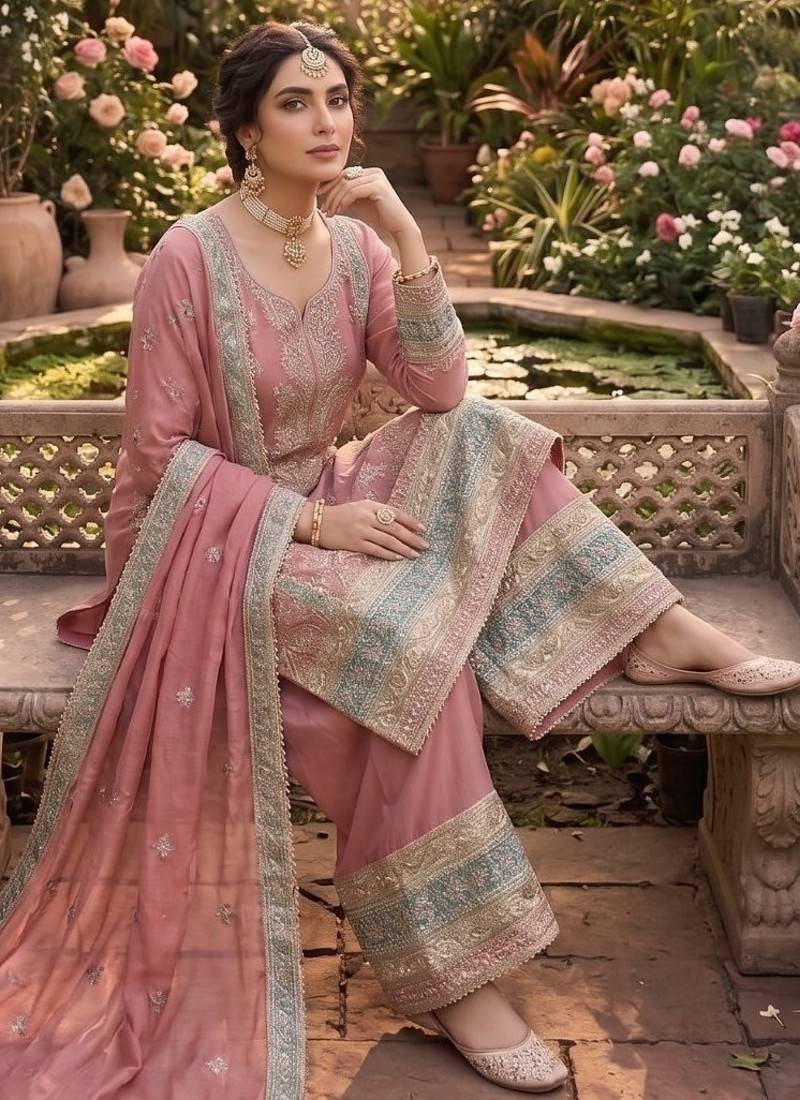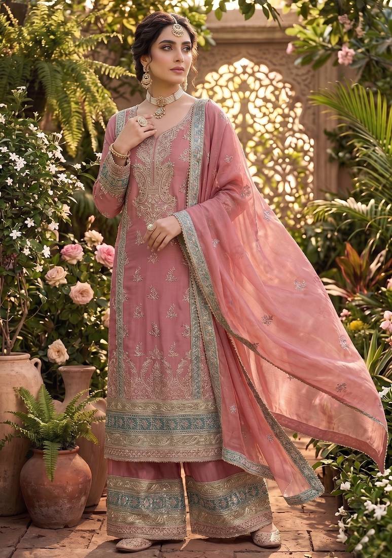 | Product Name | Pink Chinon Semi Stitched Suit With Embroidery & Sequence Work | |