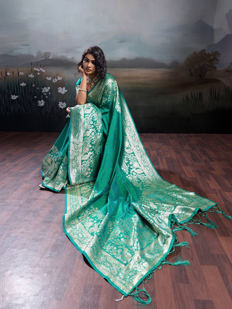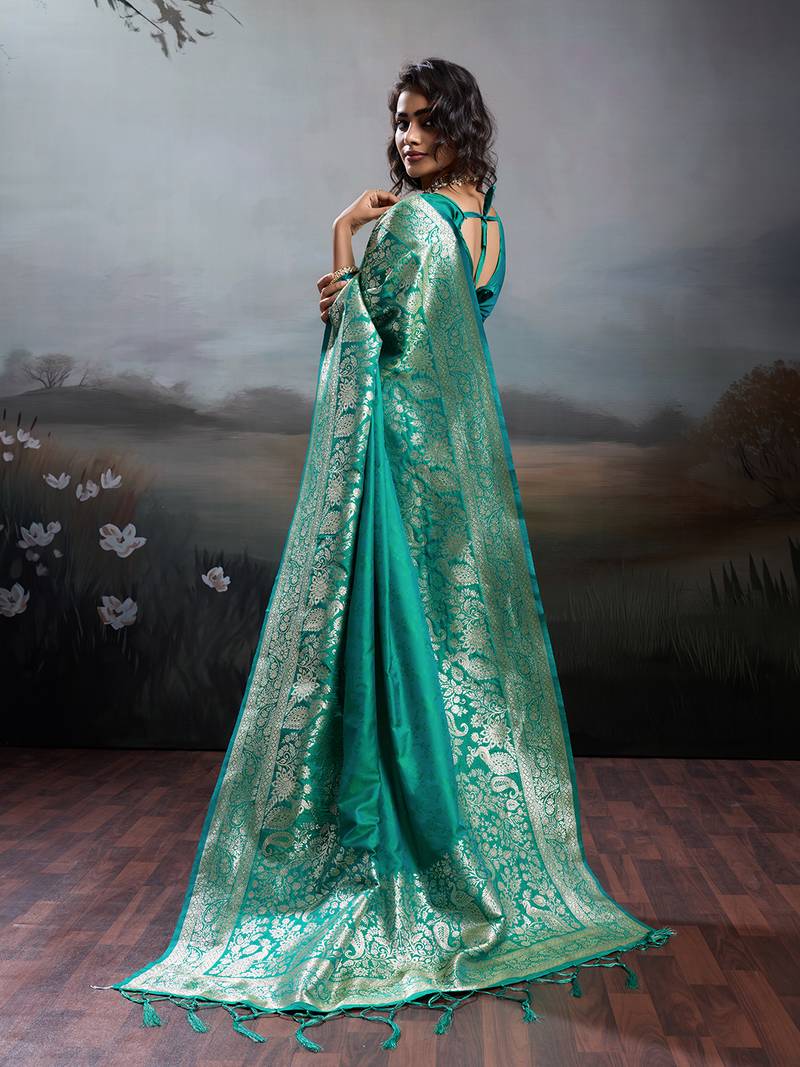 Turqoise silk blend woven saree with blouse