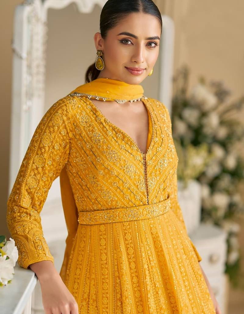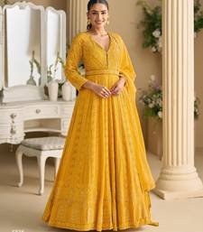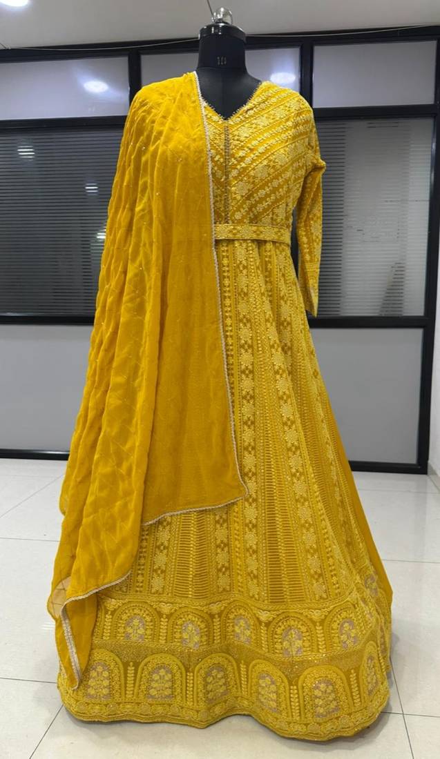 Yellow georgette free size stitched anarkali suit with embroidery & sequence work