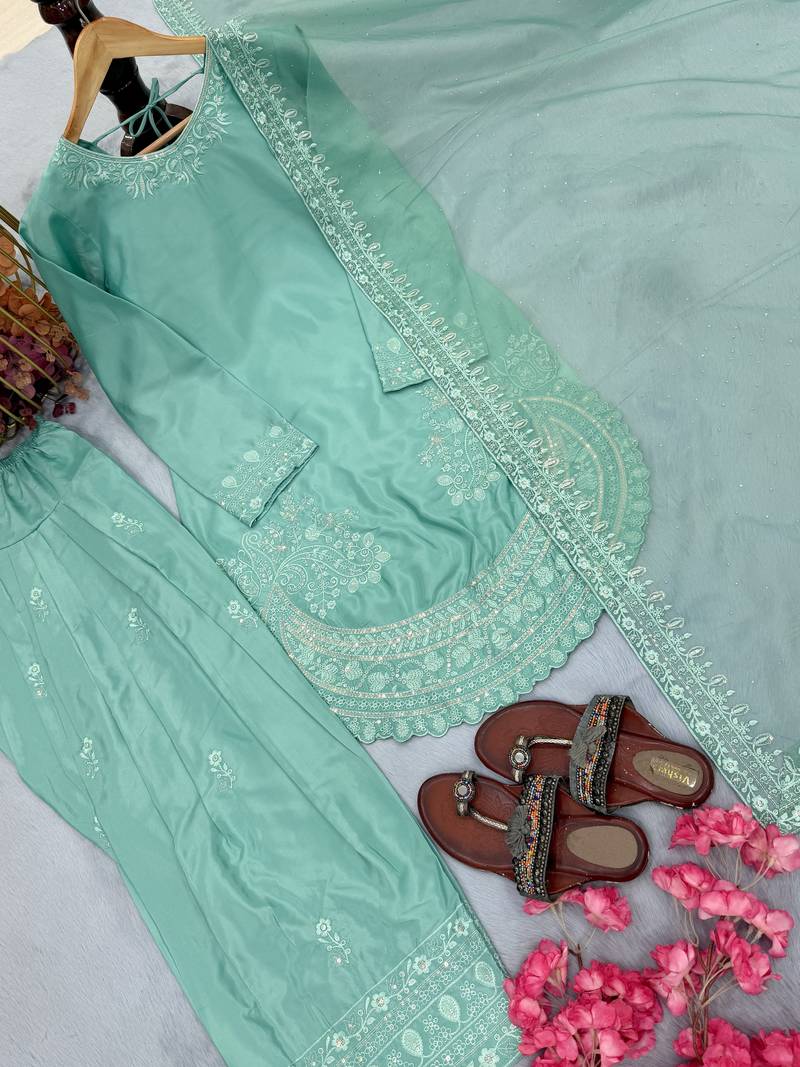 Designer party wear crepe top with farshi palazzo & organza dupatta set stitched