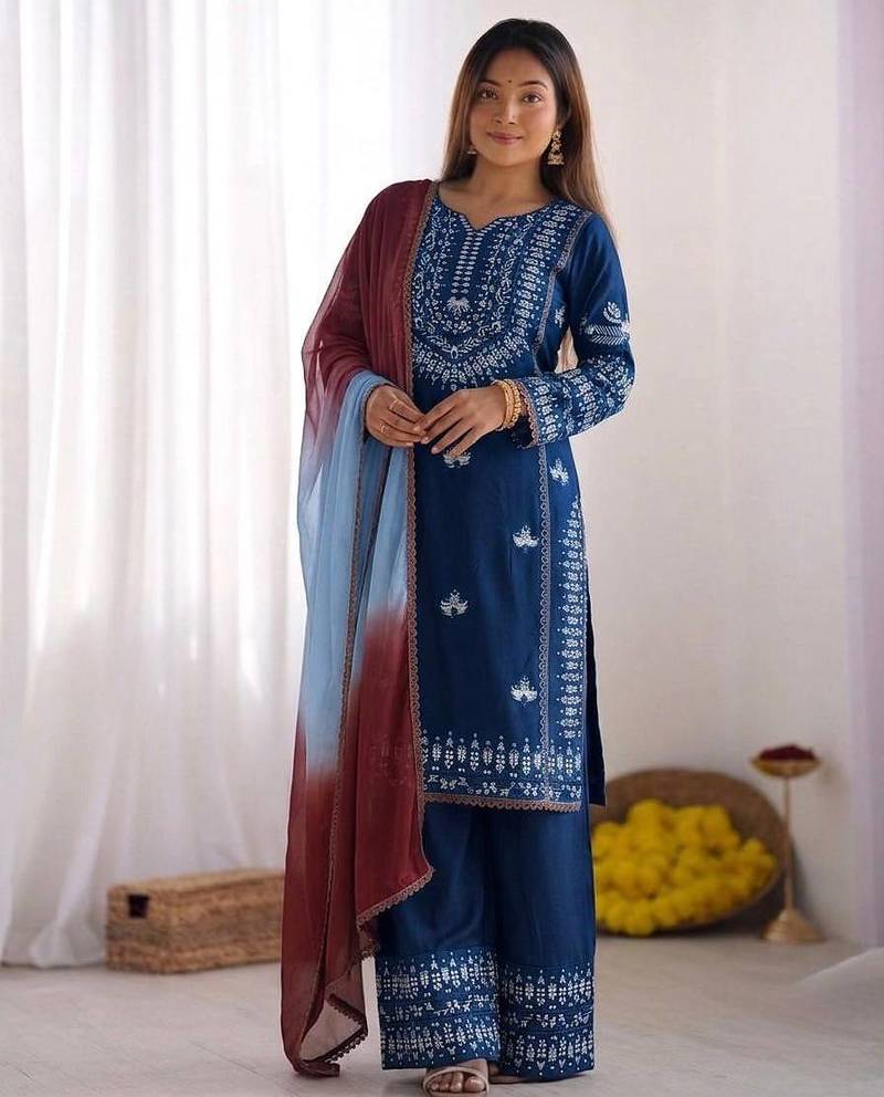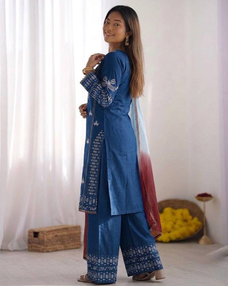 | Product Name | Embroidered Rayon Cotton Kurta Set With Farshi Pant & Georgette Dupatta | Ready To Wear | |