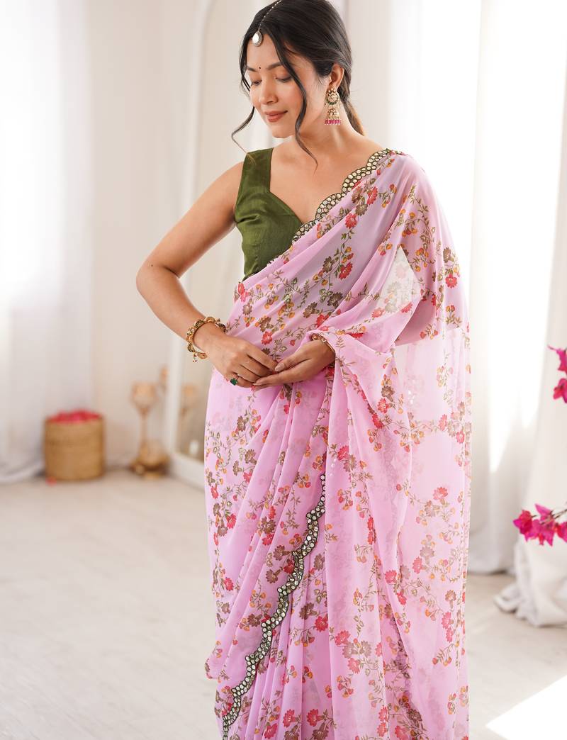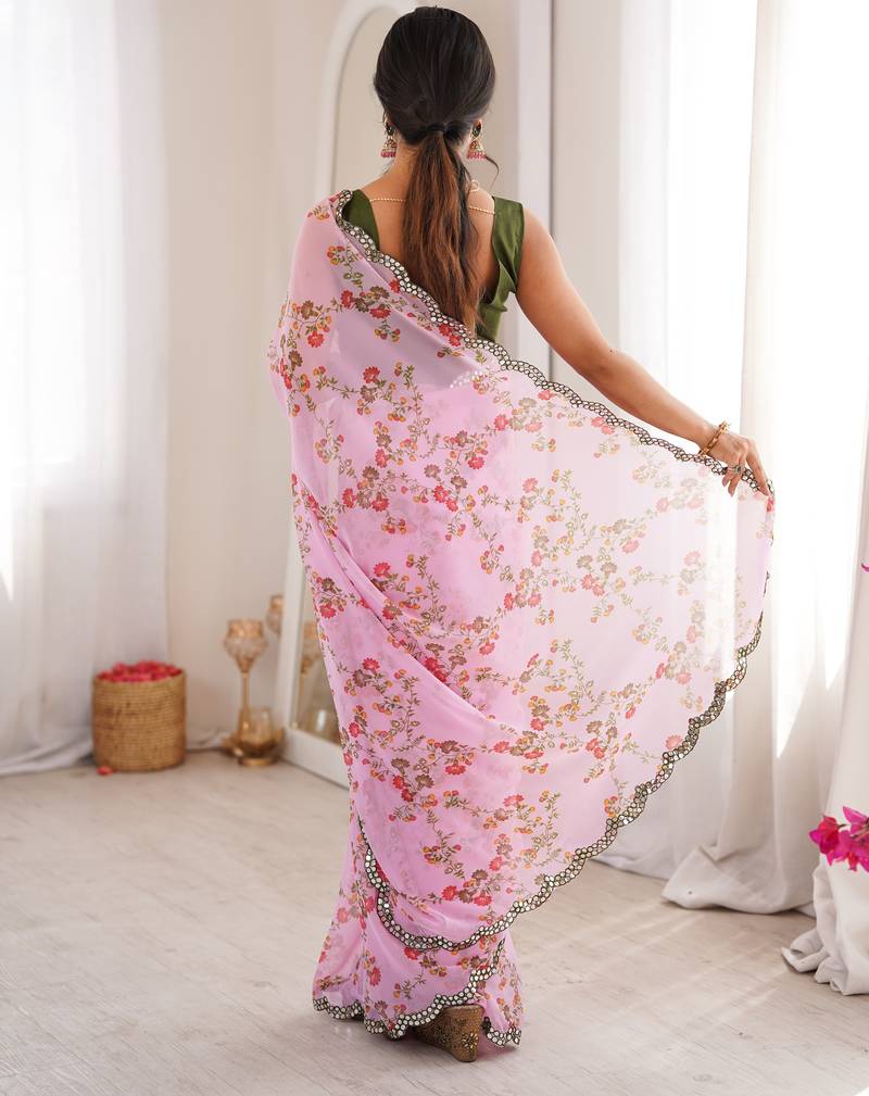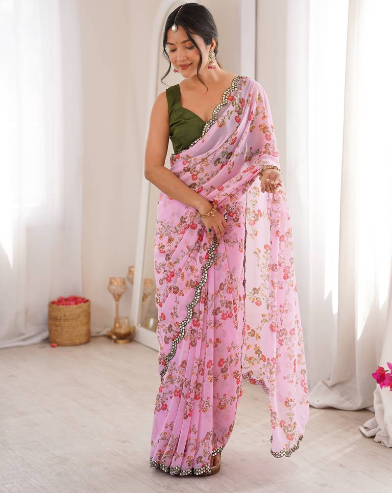 Heavy georgette floral mini flower print saree with mirror work & cutwork border