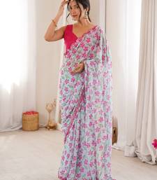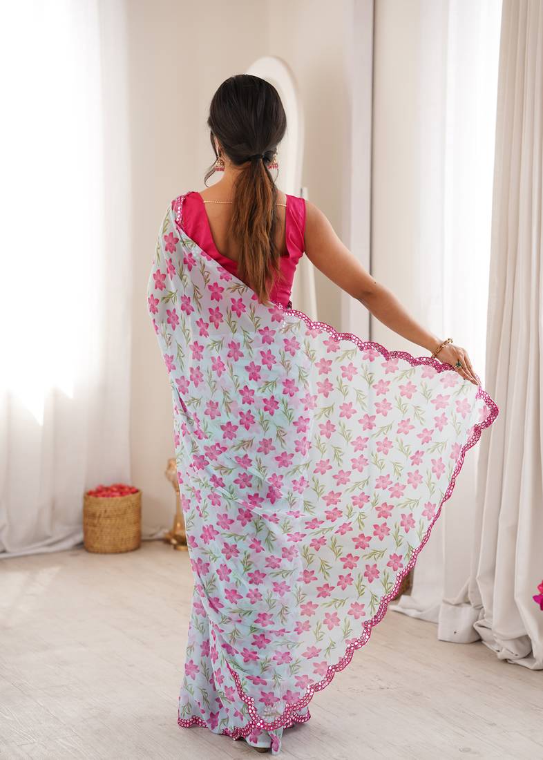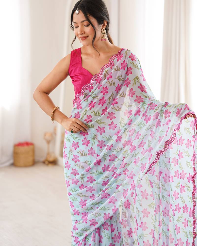 Heavy georgette mini flower floral print saree with mirror work & cutwork border