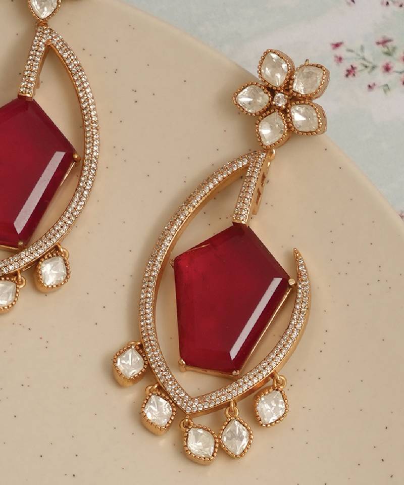 | Product Description | These Gold Plated Kundan Earrings Adorned With Red Stones Showcase Intricate Craftsmanship And Traditional Elegance. The Detailed Design And Rich Tones Make Them Ideal For Festive And Bridal Wear. A Perfect Accessory To Elevate Your Ethnic Look With A Touch Of Timeless Sophistication And Charm.