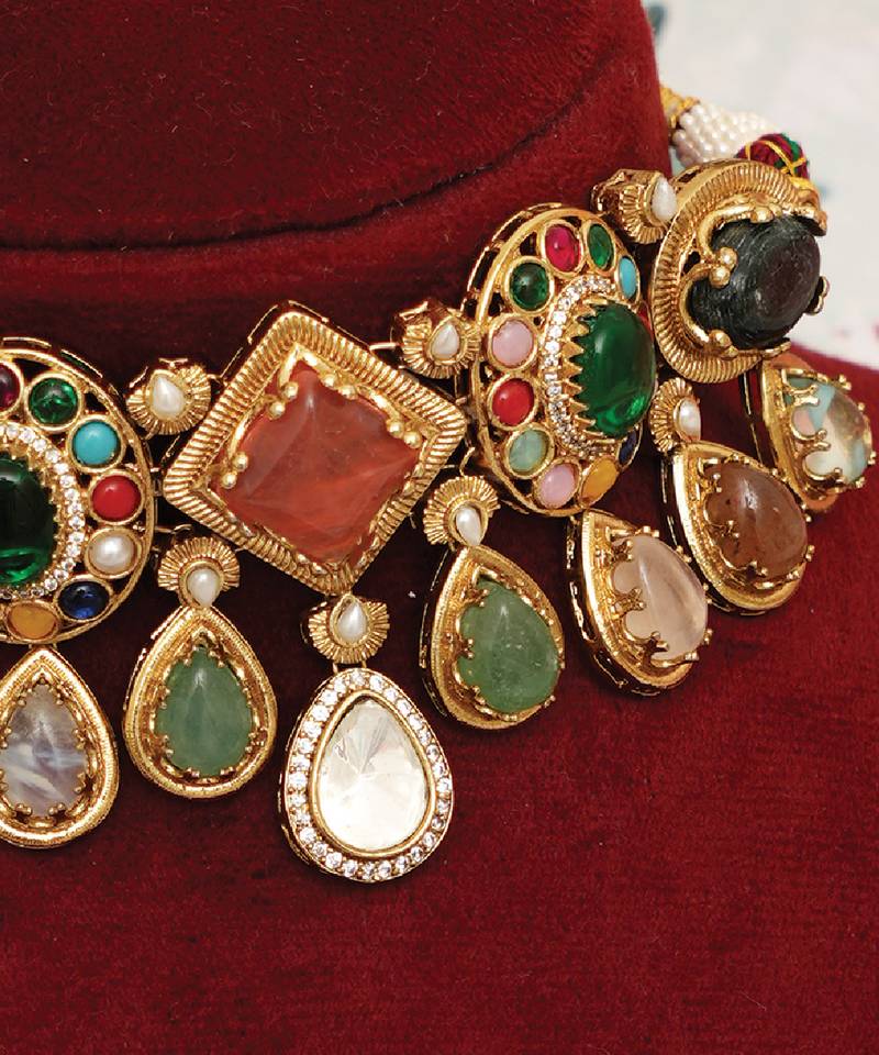 | Product Description | Featuring A Vibrant Arrangement Of Multicolor Stones, This Gold Plated Choker Necklace Set Adds A Lively And Festive Touch. The Intricate Design Enhances Its Traditional Charm, Making It Ideal For Celebrations. Its Eye Catching Appeal Pairs Beautifully With Various Ethnic Outfits, Adding Elegance And Color.