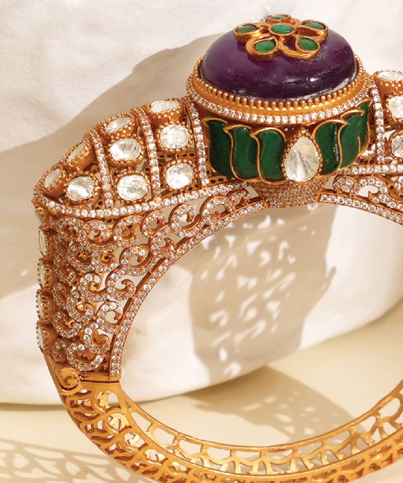 | Product Description | This Zircon Purple Stone Royal Kada Features A Rich And Elegant Design With Beautifully Studded Stones. The Deep Purple Tones Add A Regal Charm, Making It Perfect For Festive And Special Occasions. Its Intricate Craftsmanship Enhances Your Look With A Sophisticated And Luxurious Appeal.